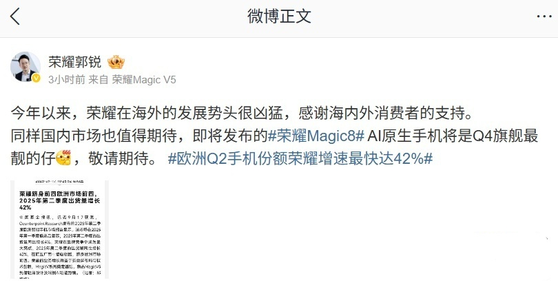 在弱光场景下,荣耀Magic 8系列采用了“像素四合一2.4um+多帧融合”的技术;该技术使得用户即使在手持拍摄时,也能在1秒内稳定拍摄,并且夜景出片速度缩短至0.8秒。意味着,用户在夜晚拍摄时,不再需要长时间的曝光和三脚架的辅助,大大提升了拍摄的便捷性和实用性。另外,近日,荣耀品牌营销总裁、集团首席营销官 @荣耀郭锐 在展示 @荣耀手机 在海外市场的优异表现时也再次透露,该系列旗舰新机将会在第四季度(Q4)发布。