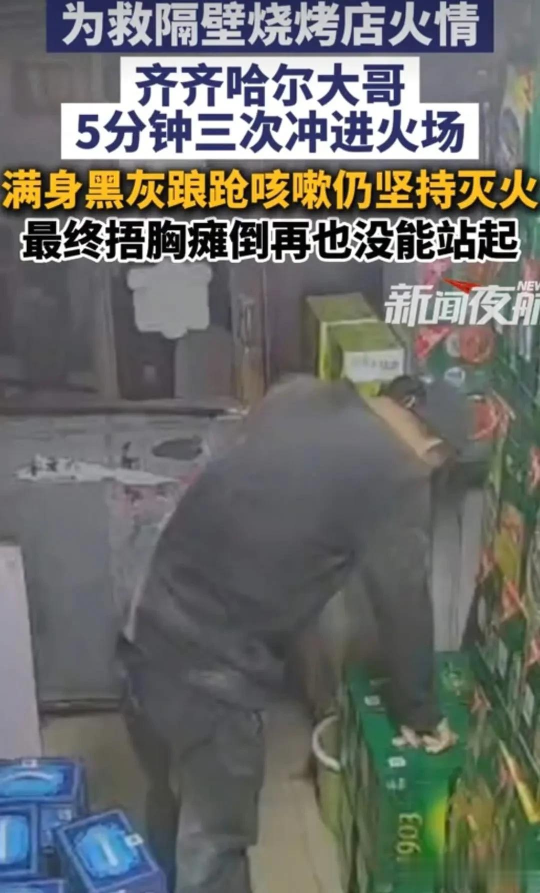 等到他第三次拿完灭火器往火场跑时,因为一直在高温浓烟里,实在撑不住了,当场倒地。