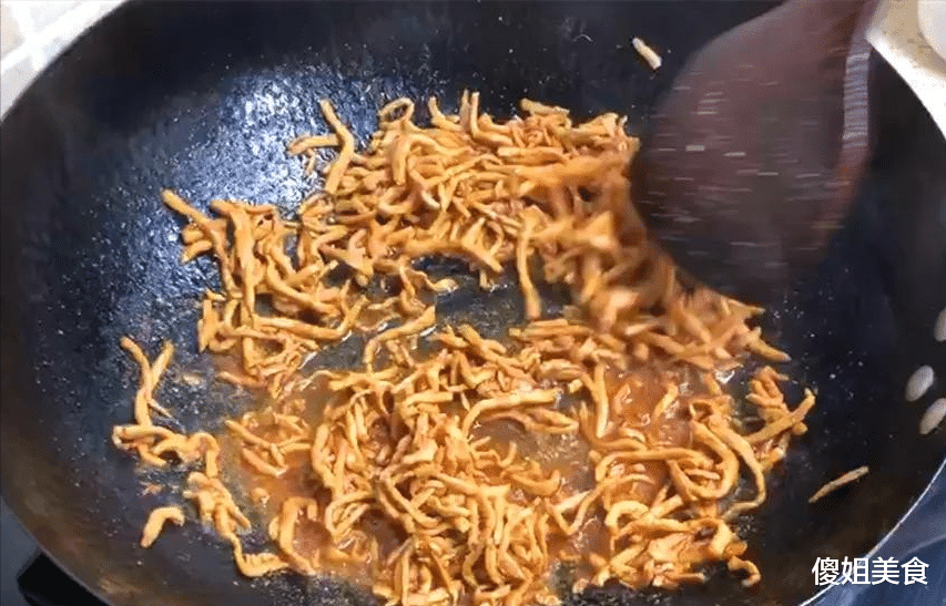 3、锅里放油烧热,下肉丝快速划散,炒到变色微微发黄,淋上一点味极鲜提鲜增香。