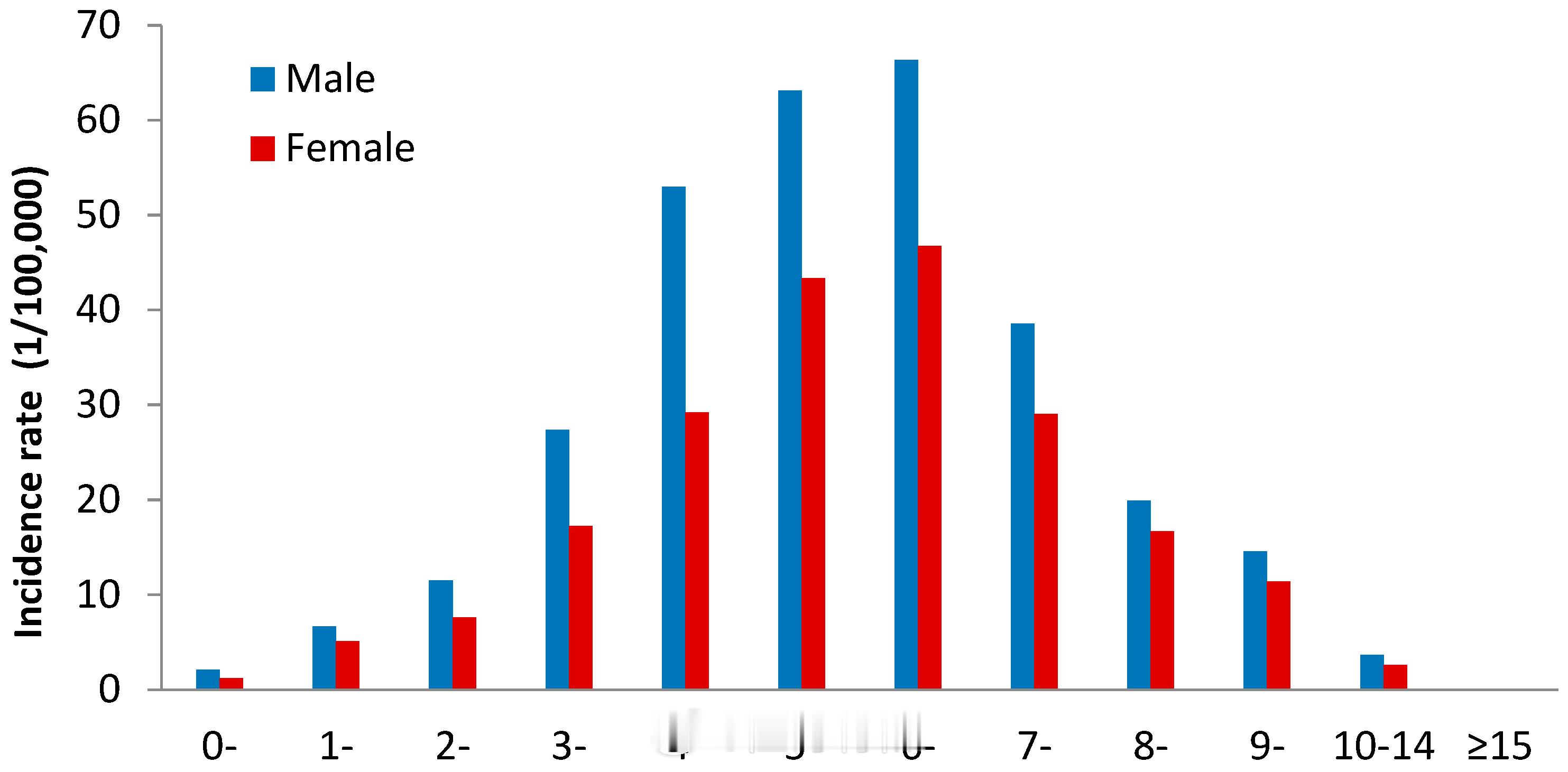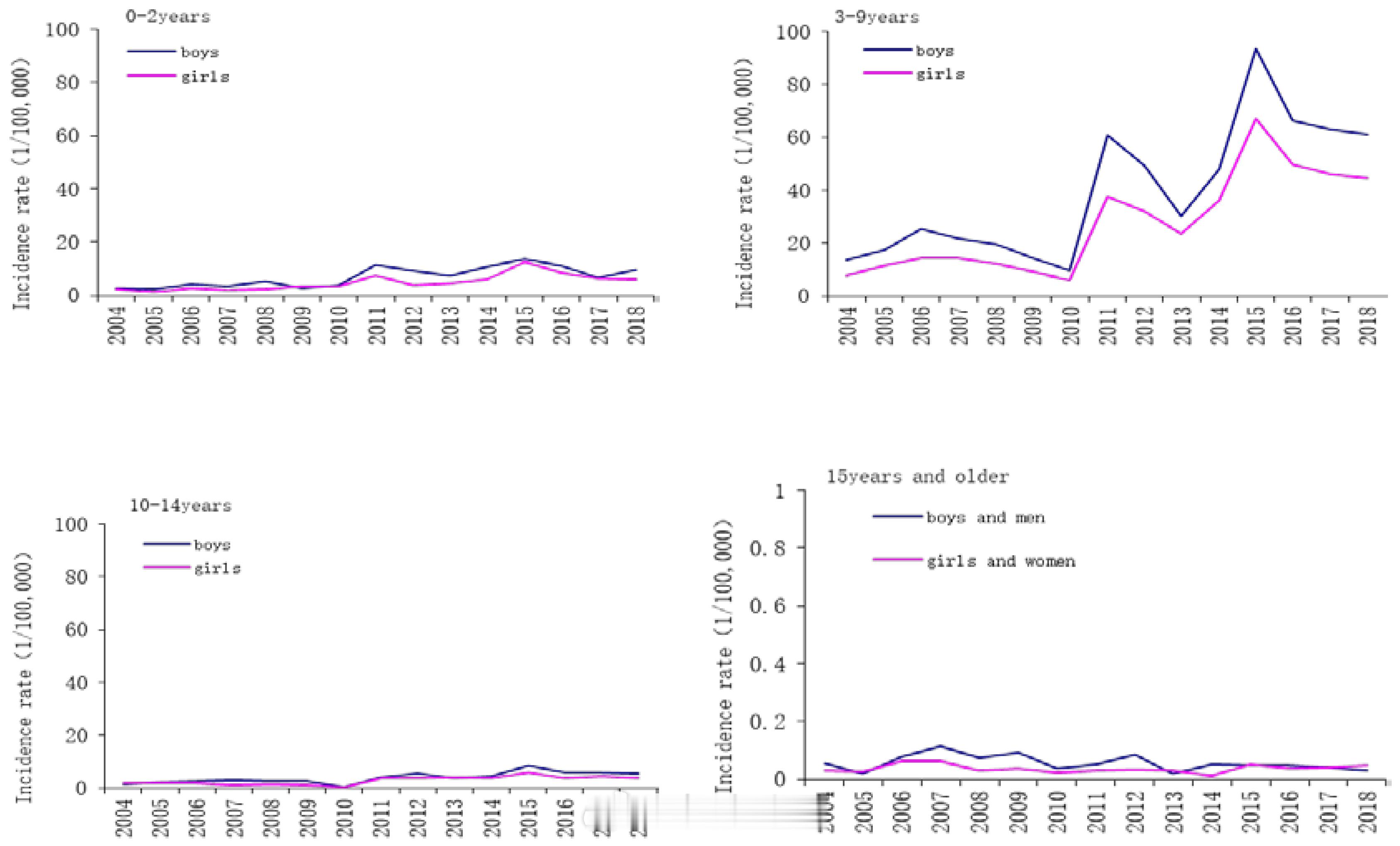 而在国内的同一年份当中,猩红热往往有两个发病高峰,分别为5~6月和11~12月(图3)。猩红热的患病人群中基本都是10岁以内儿童,最主要是3~9岁儿童(占比超过85%,图4~图6浙江省2004~2018年的病例统计),男孩比女孩更多,这可能跟男孩更加好动有关。