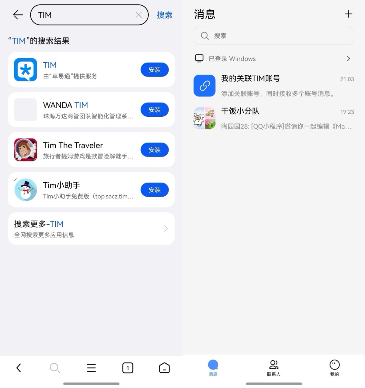 操作并不复杂,步骤如下:先在鸿蒙5手机上打开卓易通的“搜应用”,在搜索框搜索:TIM,认准腾讯官方开发的版本并点击安装。安装完成后打开TIM,用你的QQ账号登录。