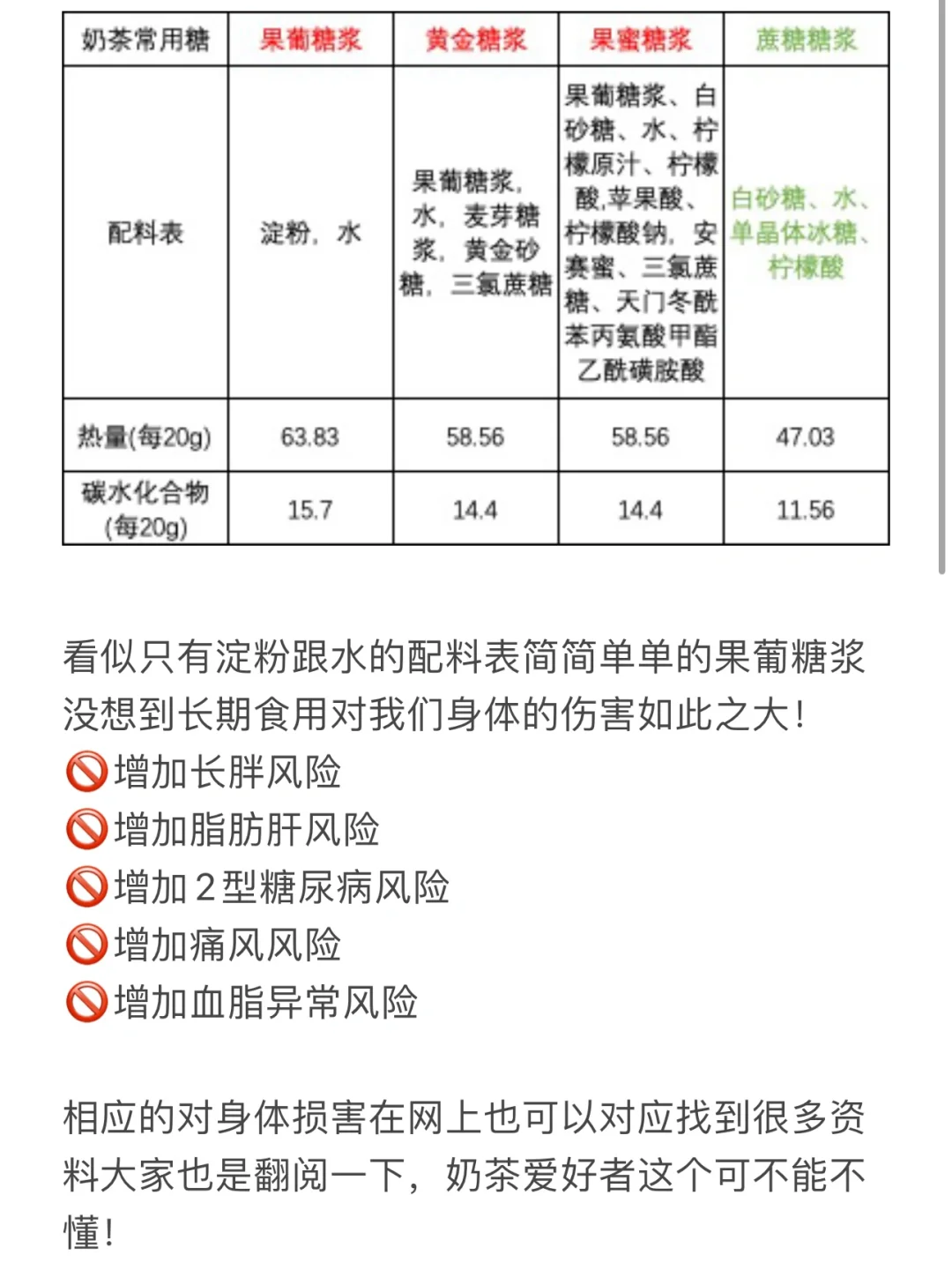 ❌果葡糖浆看似只有淀粉跟水,不深入研究我们根本不知道天天喝对我们的身体有多大的伤害:影响血糖调节、引起肝脏疾病、诱发痛风、损害神经等等!!对奶茶爱好者们来说,糖原料是否健康真的不能不懂!现在大多数奶茶品牌使用的是像果葡糖浆这一类的廉价甜味剂,网上有很多资料都介绍了果葡糖浆对人体会造成的危害。