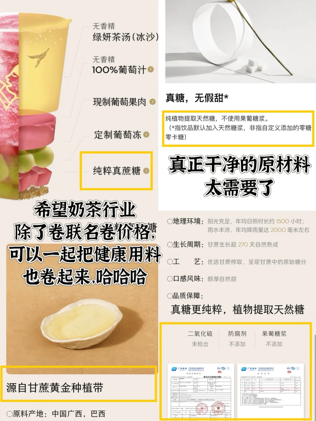 ‼️所以建议大家在选奶茶的时候,多关注奶茶里加的是什么糖,像添加了果葡糖浆这种的,尽量能不加糖就不加!如果有配方表的一定要点进去看看!并不是每一个品牌都会公布糖原料,翻遍了奶茶点单小程序也只发现喜茶一家公布使用“真蔗糖”,对于已提供的蔗糖检测报告也别忘了点进去查看核实!