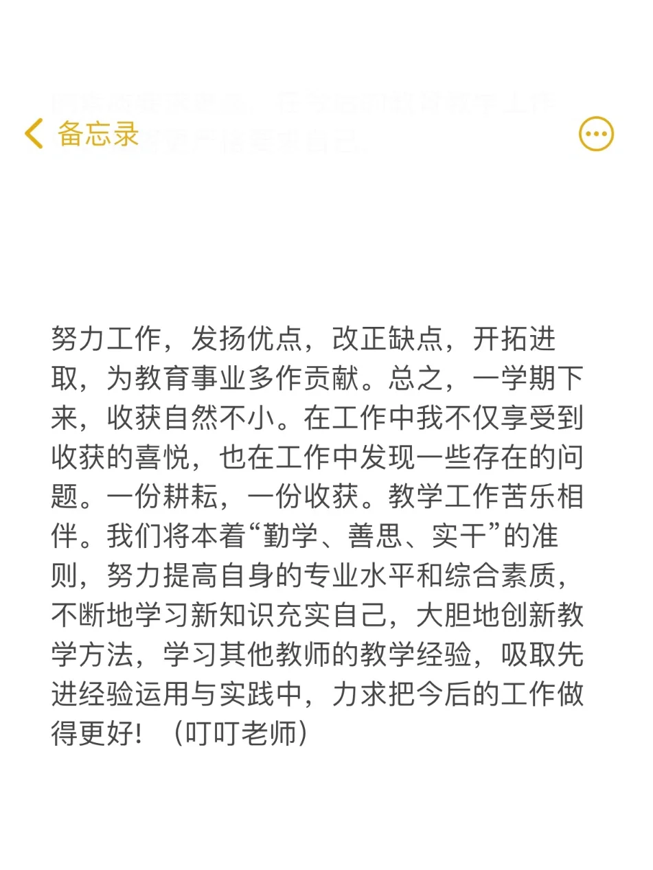 ️▫️忙忙碌碌,转眼间,一个紧张而又充实的学期过去了。回顾这学期,忙碌而愉快的工作中,在学校其他老师和领导的支持下,我也取得了一些较大的进步。在这里我对本学期的工作做个小结,并从中拮其精华加以保存,寻找不足加以弥补,争取在新的一学年中取得更大的提高。