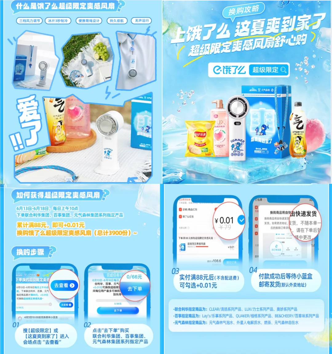 6/13-6/18上饿了么下单指定商品满88元+0.01元换购饿了么超级限定爽感风扇!