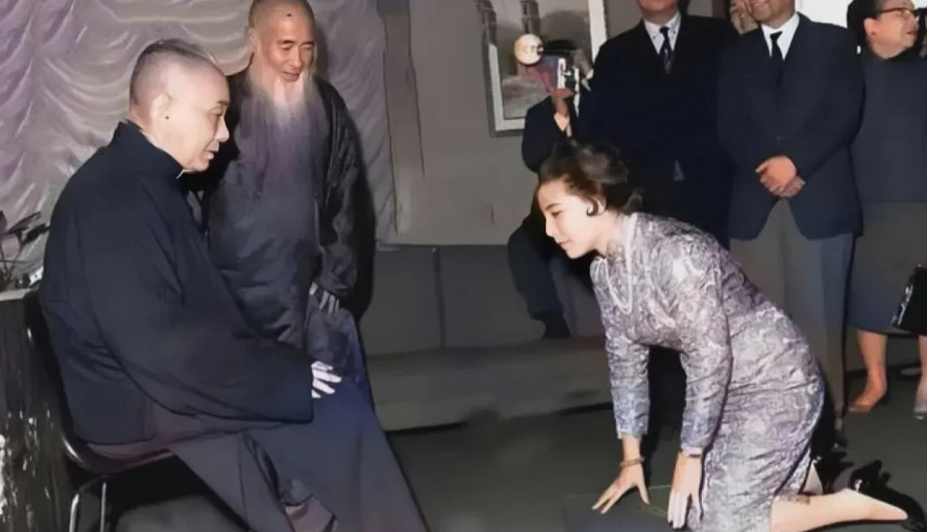 1968年,台北张大千的四姨太徐雯波,正恭敬地跪在地上拜师。镜头下的徐雯波身穿旗袍,戴着珍珠项链,华贵讲究。她的师傅端坐在前方的凳子上,周围有不少人共同见证这十分重要的时刻,而张大千则在一旁露出了十分欣慰的笑容,很显然,这是他想要看到的结果。
