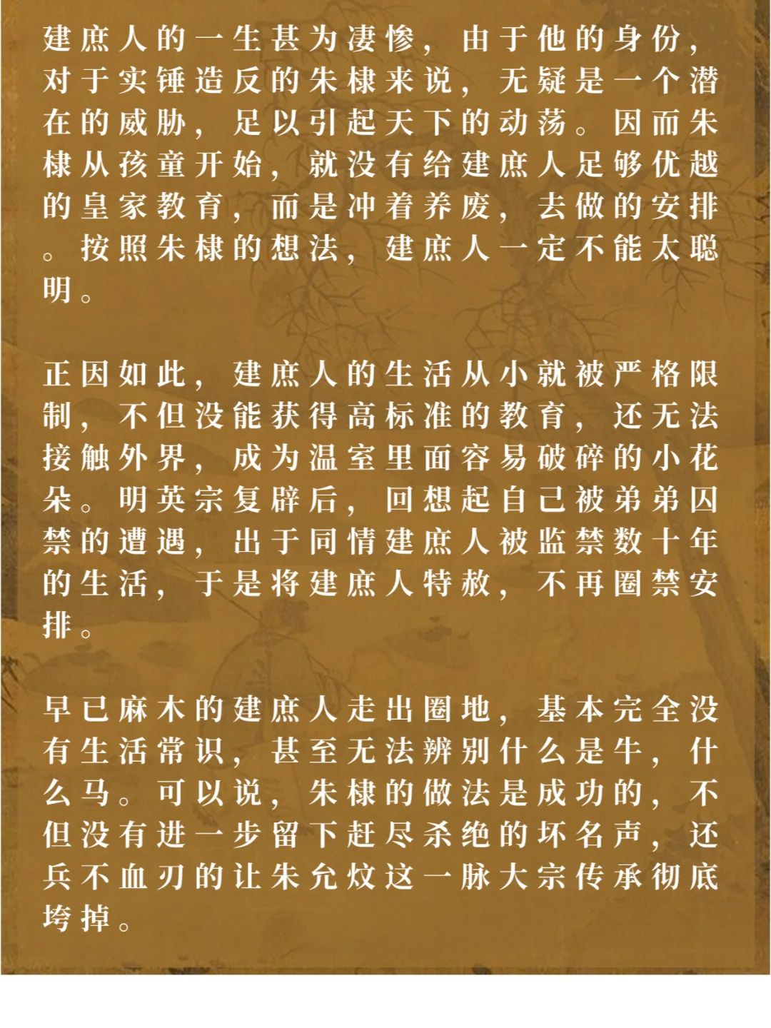 正因如此,建庶人的生活从小就被严格限制,不但没能获得高标准的教育,还无法接触外界,成为温室里面容易破碎的小花朵。明英宗复辟后,回想起自己被弟弟囚禁的遭遇,出于同情建庶人被监禁数十年的生活,于是将建庶人特赦,不再圈禁安排。