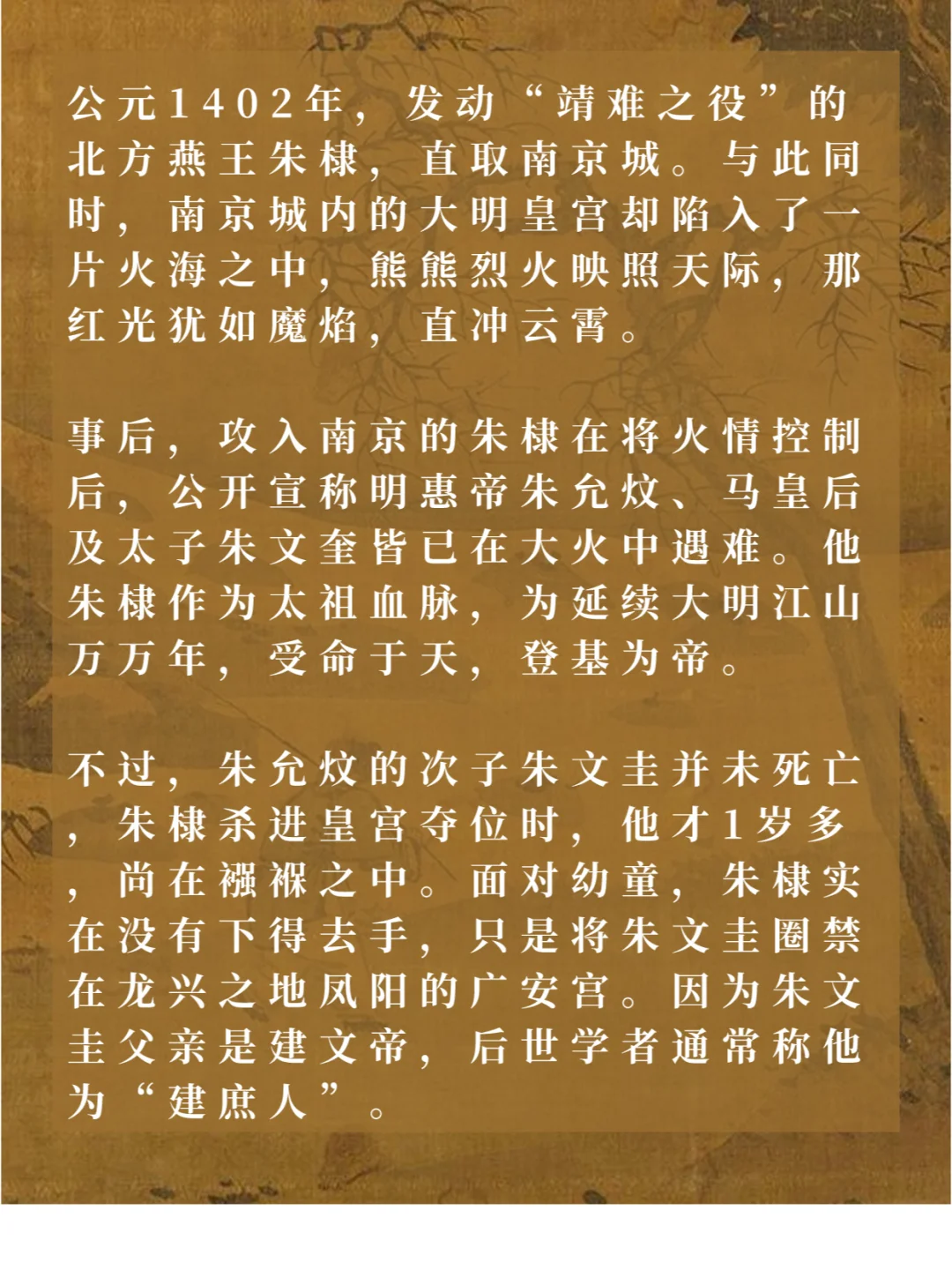 公元1402年,发动“靖难之役”的北方燕王朱棣,直取南京城。与此同时,南京城内的大明皇宫却陷入了一片火海之中,熊熊烈火映照天际,那红光犹如魔焰,直冲云霄。