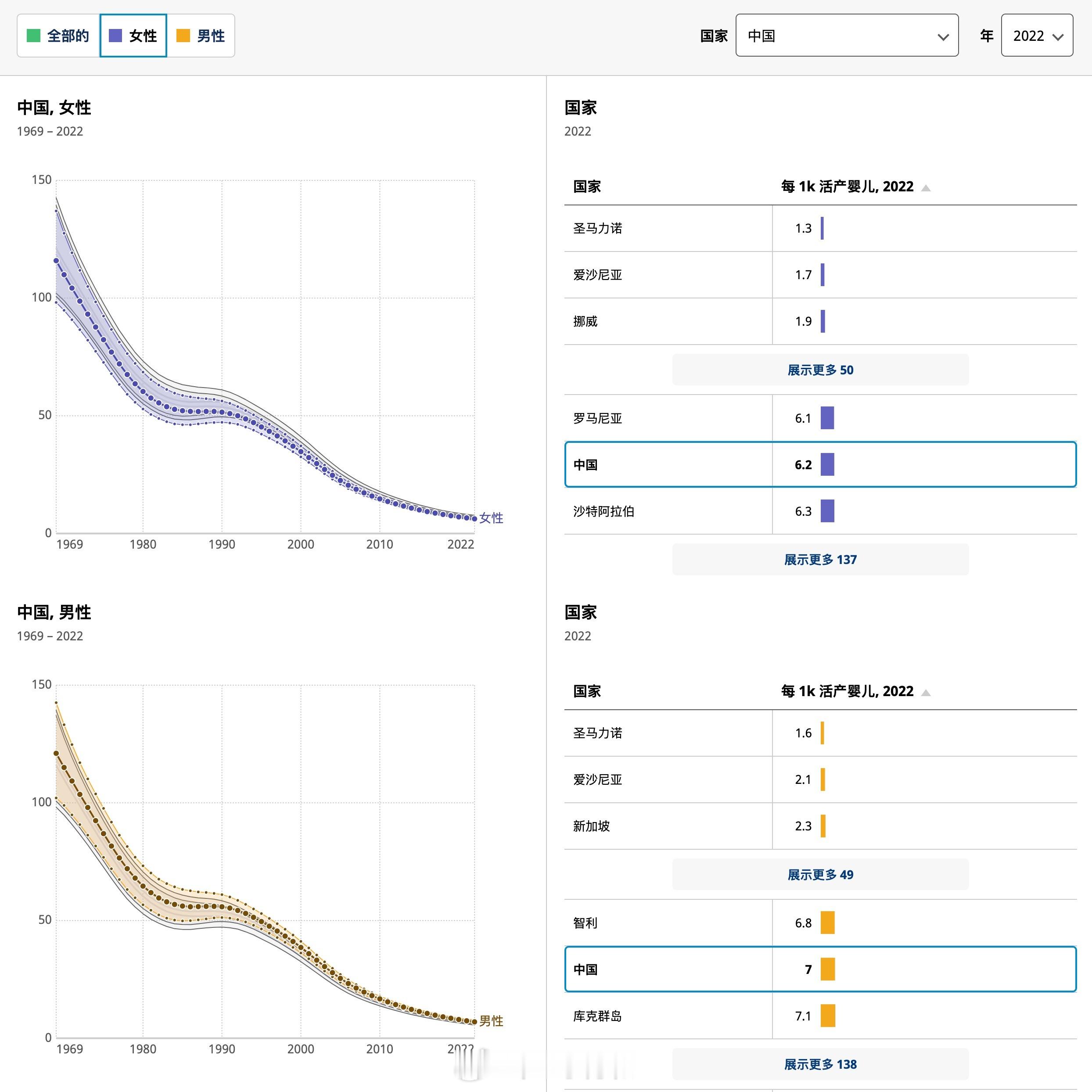 3. 由于生物学差异,在几乎所有国家和地区,男孩的死亡率都会略高于女孩,5岁以下全年龄段均是如此。例如2022年的数据,每1000名活产婴儿5岁以下死亡人数,男孩的全球平均数据是39.3名,女孩是34.7名。
