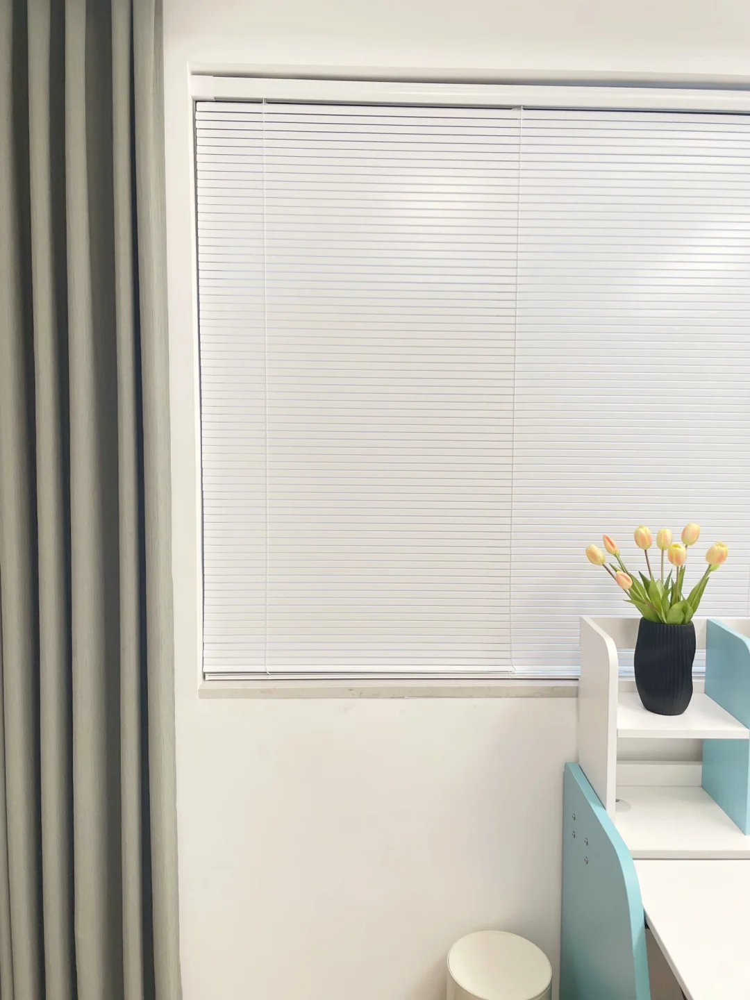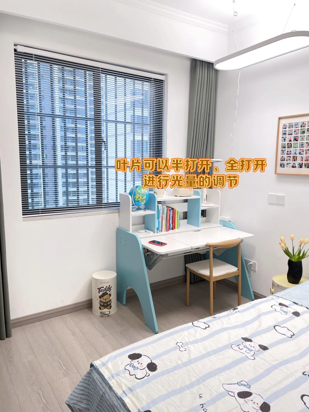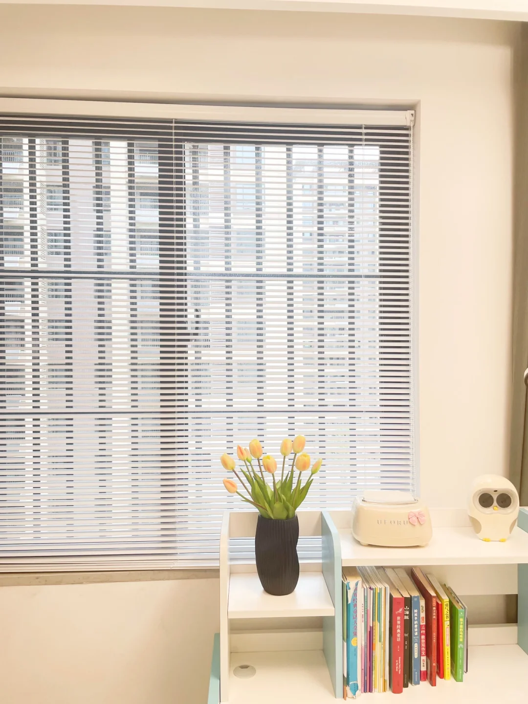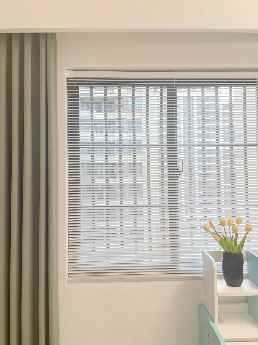 ➡️软装窗帘用的是布帘➕百叶帘。因为太爱百叶的光影,所以最近给儿童房的窗户🪟装上了百叶帘,奶油白+哑光的质地,感觉很高级,Z型叶片,闭合度蛮好的。有阳光的日子,阳光透过百叶照进来的光影真的太美了。