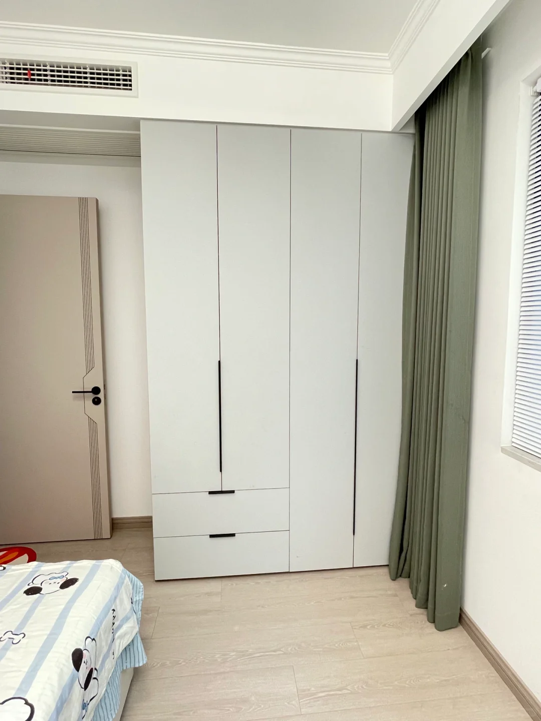 ➡️硬装装修hin简单,白色乳胶漆通刷,木地板,全屋定制做了一组一门到顶的衣柜,清爽又简约。