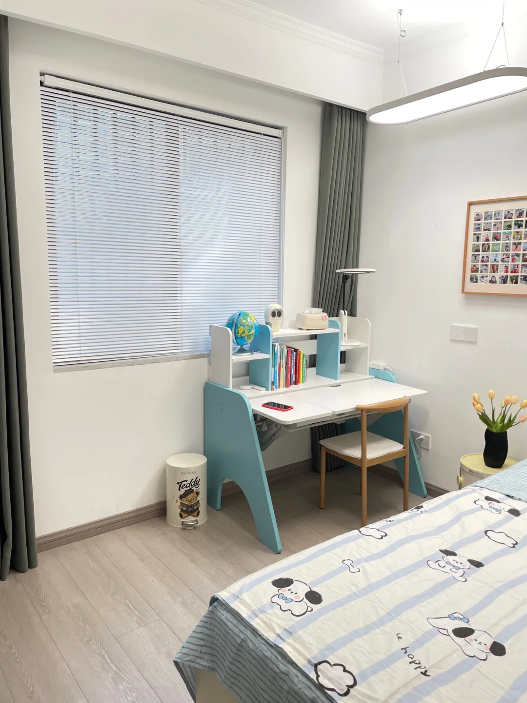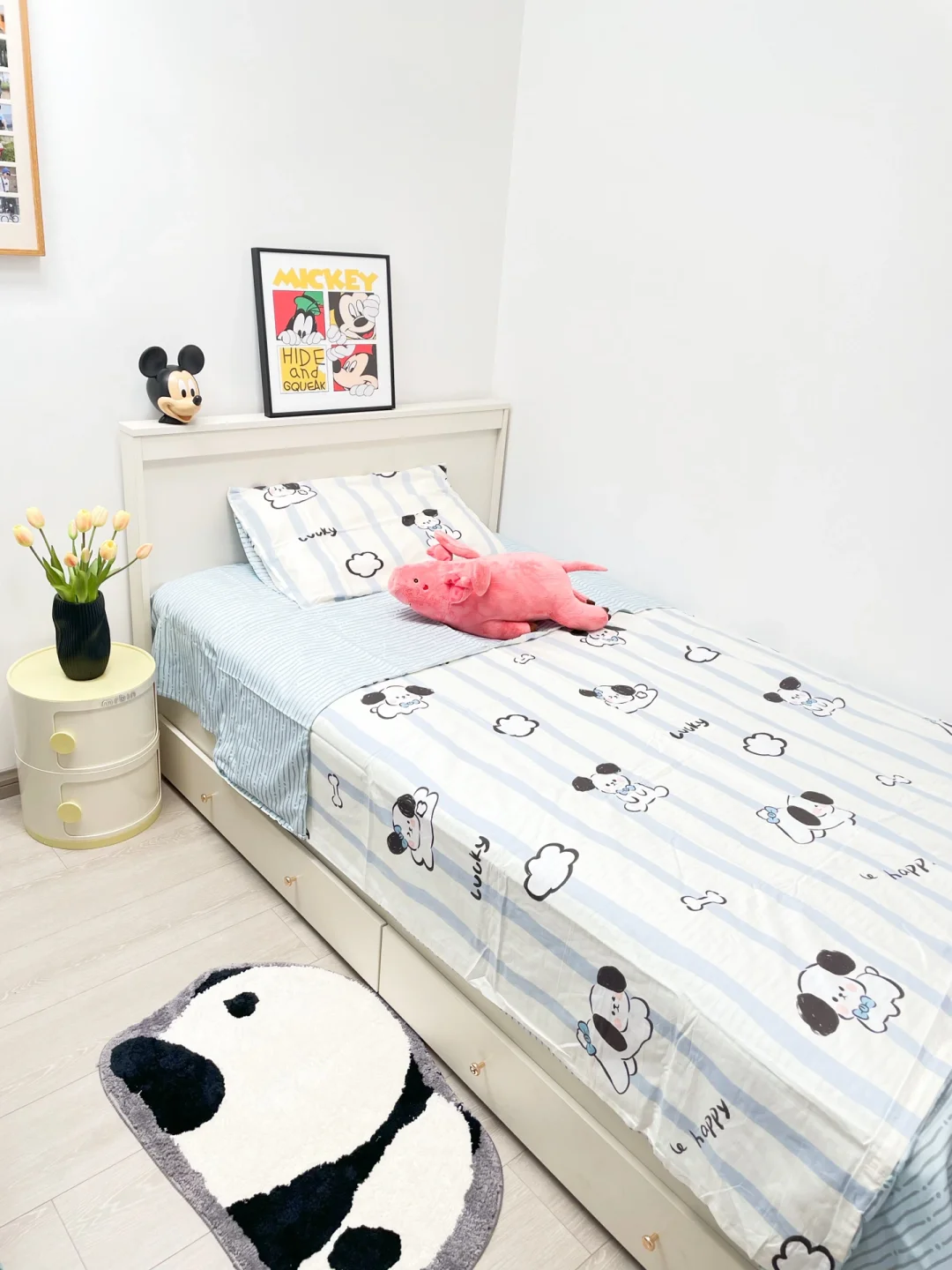 🌿铺上新的四件套,摆放一张可爱的床边毯,最后放上装饰画一些摆件,舒适又温馨的儿童房就有了~
