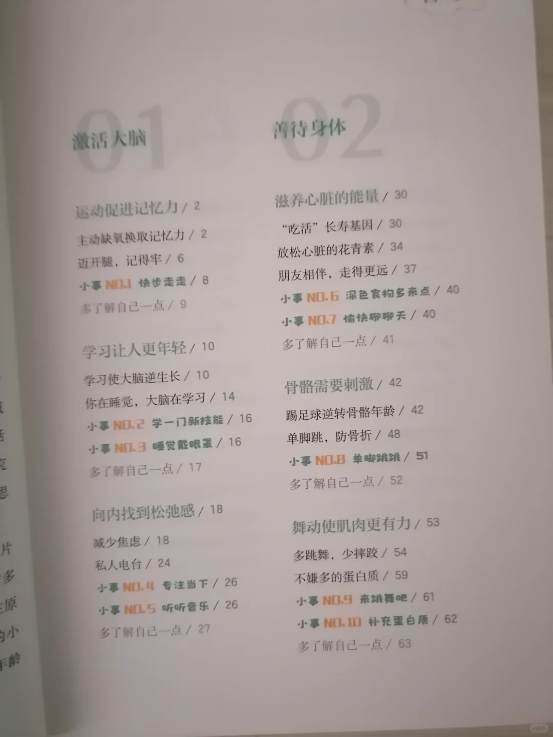 书中提到的21件小事,每一件都有科学研究的支持,每一件都足以逆转身体的一项老化进程。这些小事包括科学散步、专注冥想、饮食补充等,涵盖生活的多个方面。通过这些小事,我们有可能延缓甚至逆转老化对我们记忆、感官、免疫力等方面的不利影响。