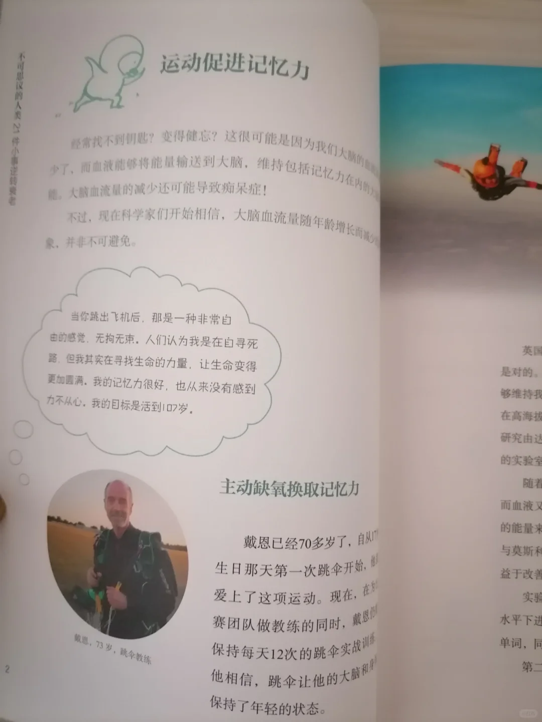 莫斯利博士通过访谈和研究,向我们展示了一群50岁踢足球、60岁滑雪、70岁跳伞、80岁跳芭蕾的活力四射的长者。这些例子让我们意识到,老年生活并不只能是被动接受衰老的过程,我们可以通过积极的生活方式和科学的方法,逆转老化的进程,享受生活。