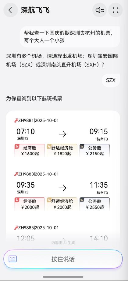 我果断找到深航飞飞Agent,直接语音说,“帮我查一下国庆假期深圳去杭州的机票,两个大人一个小孩”。深航飞飞Agent确认起飞机场后,很快就查询到了航班信息。我选好合适的航班,就能直接开始订票。整个过程不用来回切换App,还能语音输入,特别省心。