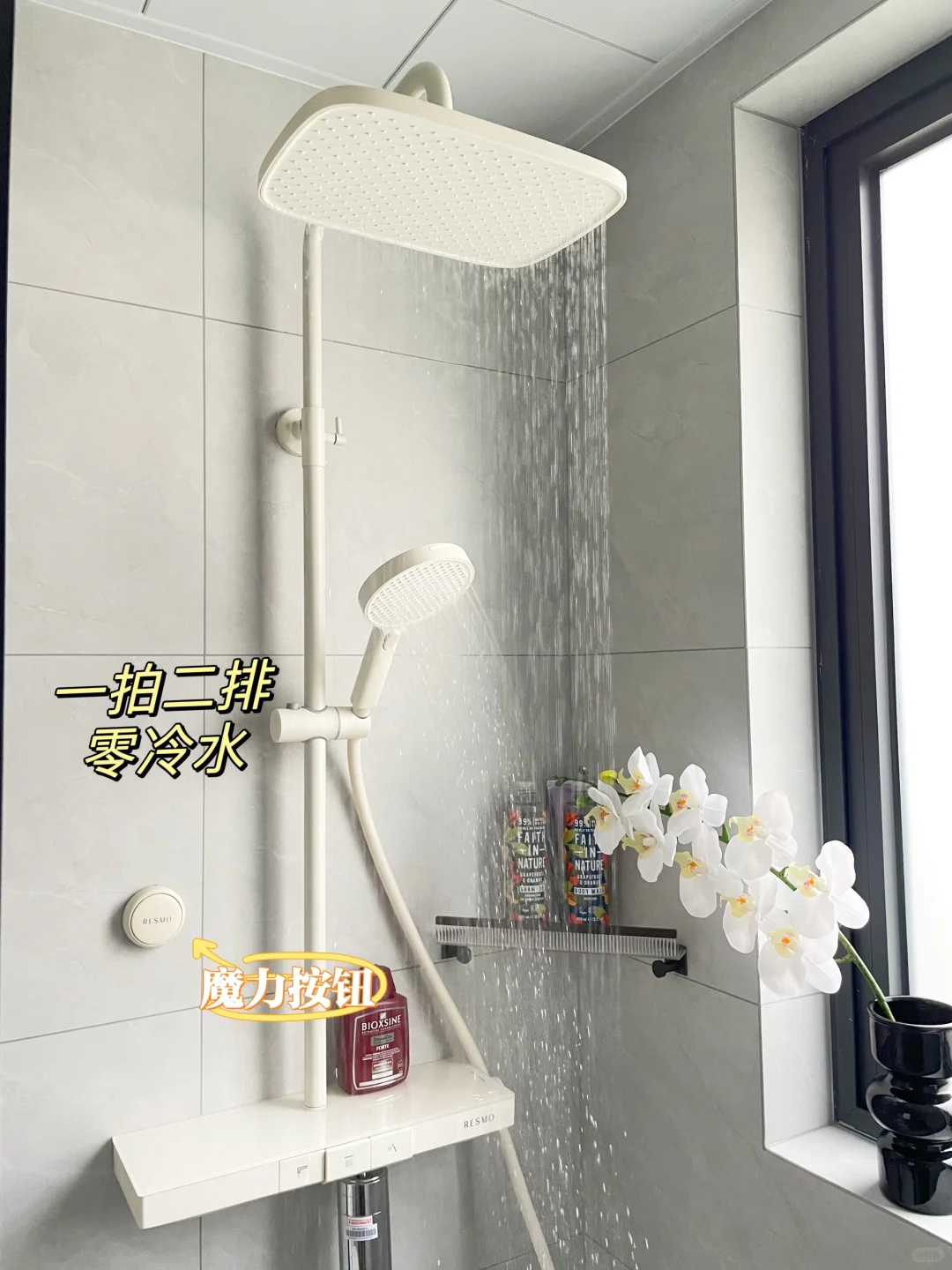 🌟奶油风0冷水花洒🚿,“一拍二排”,打开便是恒温雨淋。洗前轻拍按钮,下出水口便立刻开始排冷水。冷水排光后,打开花洒便会流出舒适热水。台面还有温度显示,可以实时看到水温。磁吸钢琴按键设计,一键一出水,高级感满满。