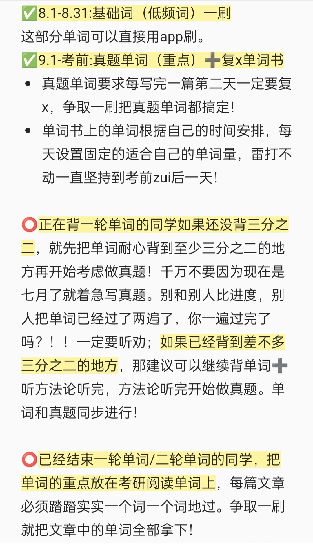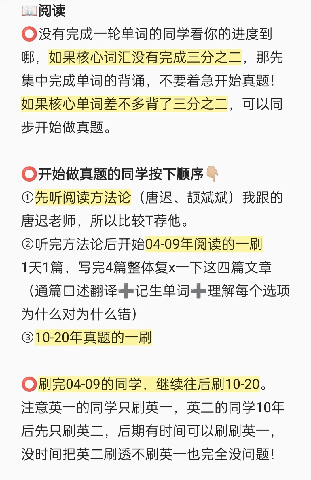 ⭕正在背一轮单词的同学如果还没背三分之二,先集中背单词再考虑做真题!如果已经背到差不多三分之二的地方,那建议可以继续背单词➕听方法论听完,方法论听完开始做真题。单词和真题同步进行!