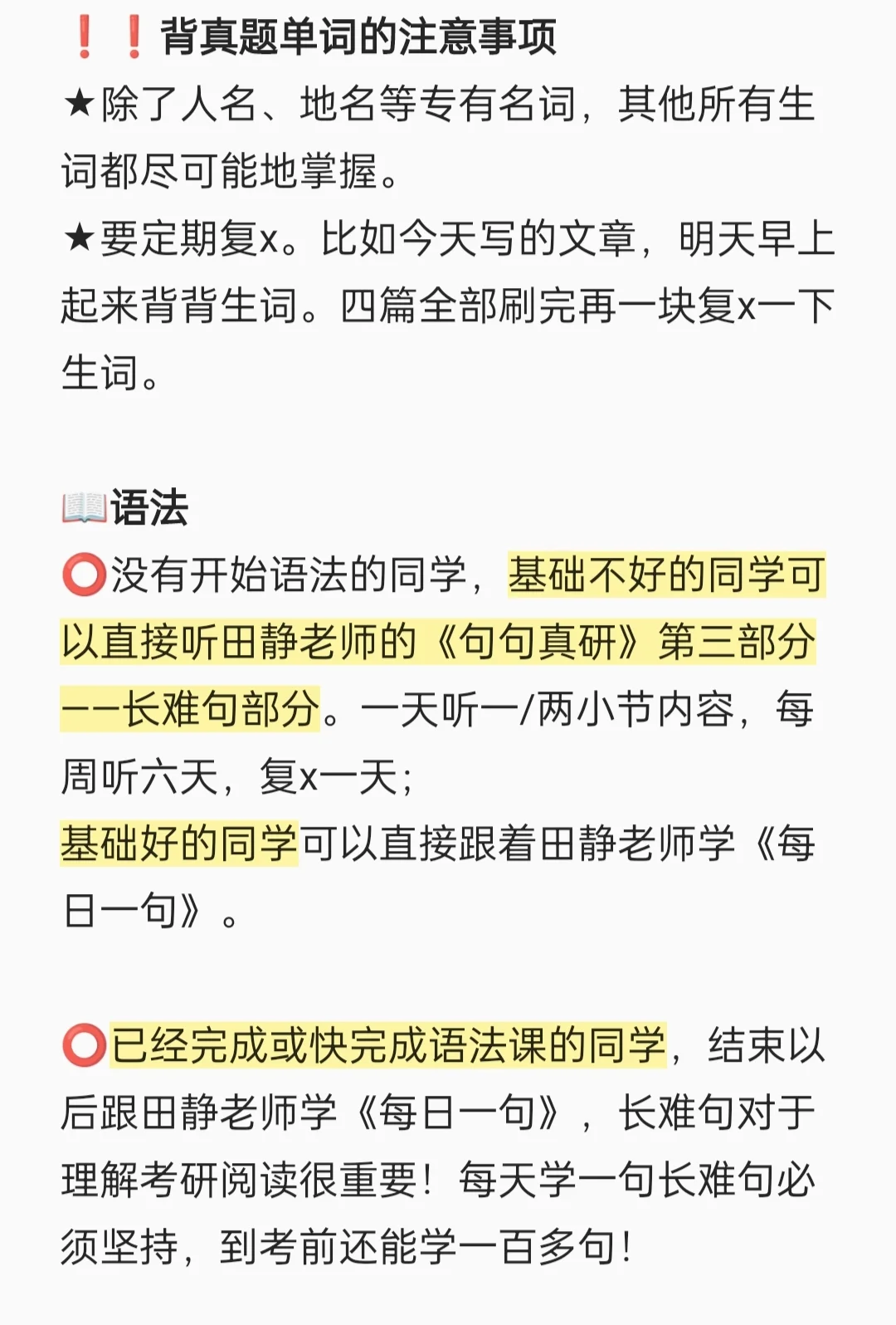 ⭕没有开始语法的同学,基础不好的同学可以直接听田静老师的《句句真研》第三部分——长难句部分。注意❗❗不是从头听。基础好的同学可以直接学《每日一句》