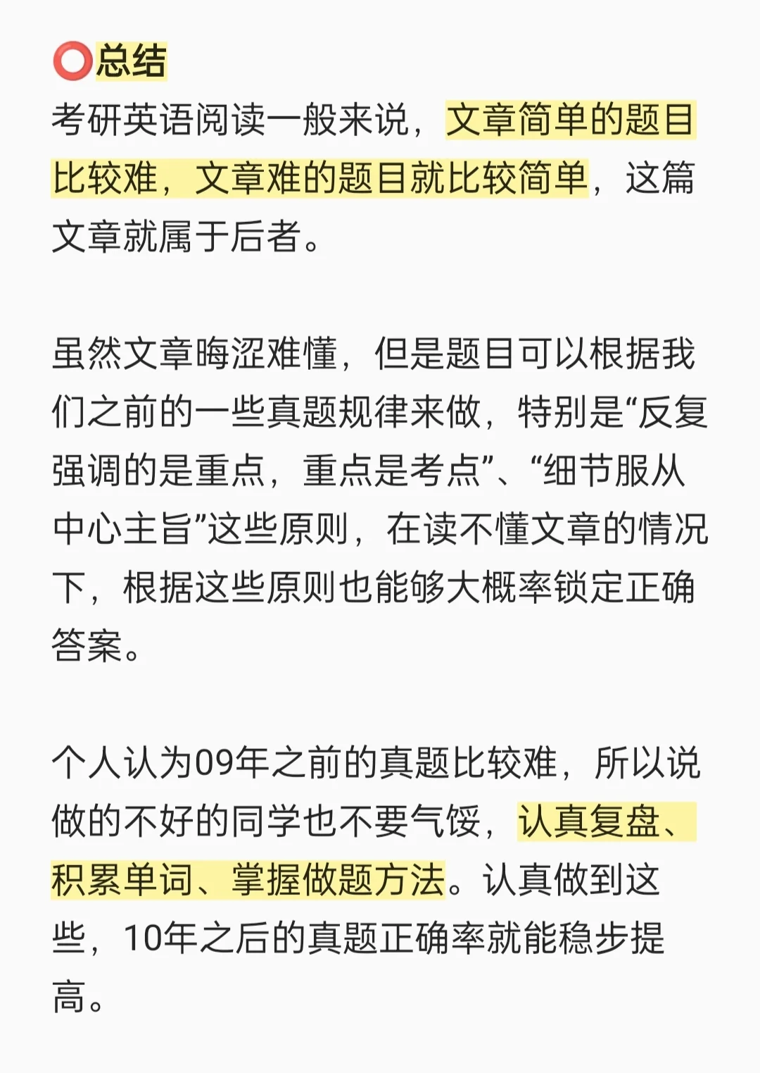 个人认为09年之前的真题比较难,所以说做的不好的同学也不要气馁,认真复盘、积累单词、掌握做题方法。认真做到这些,10年之后的真题正确率就能稳步