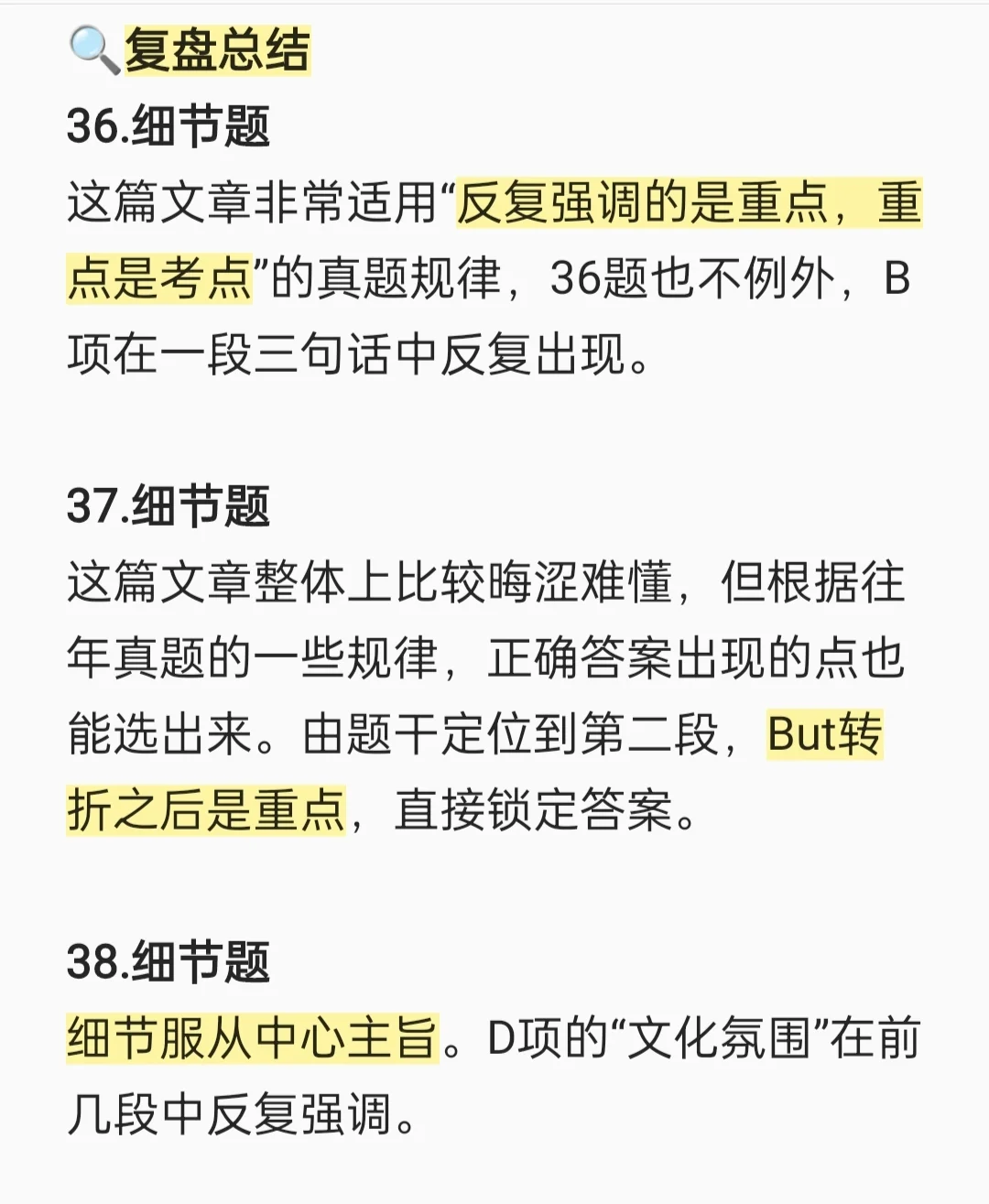 这篇文章非常适用“反复强调的是重点,重点是考点”的真题规律,36题也不例外,B项在一段三句话中反复出现。