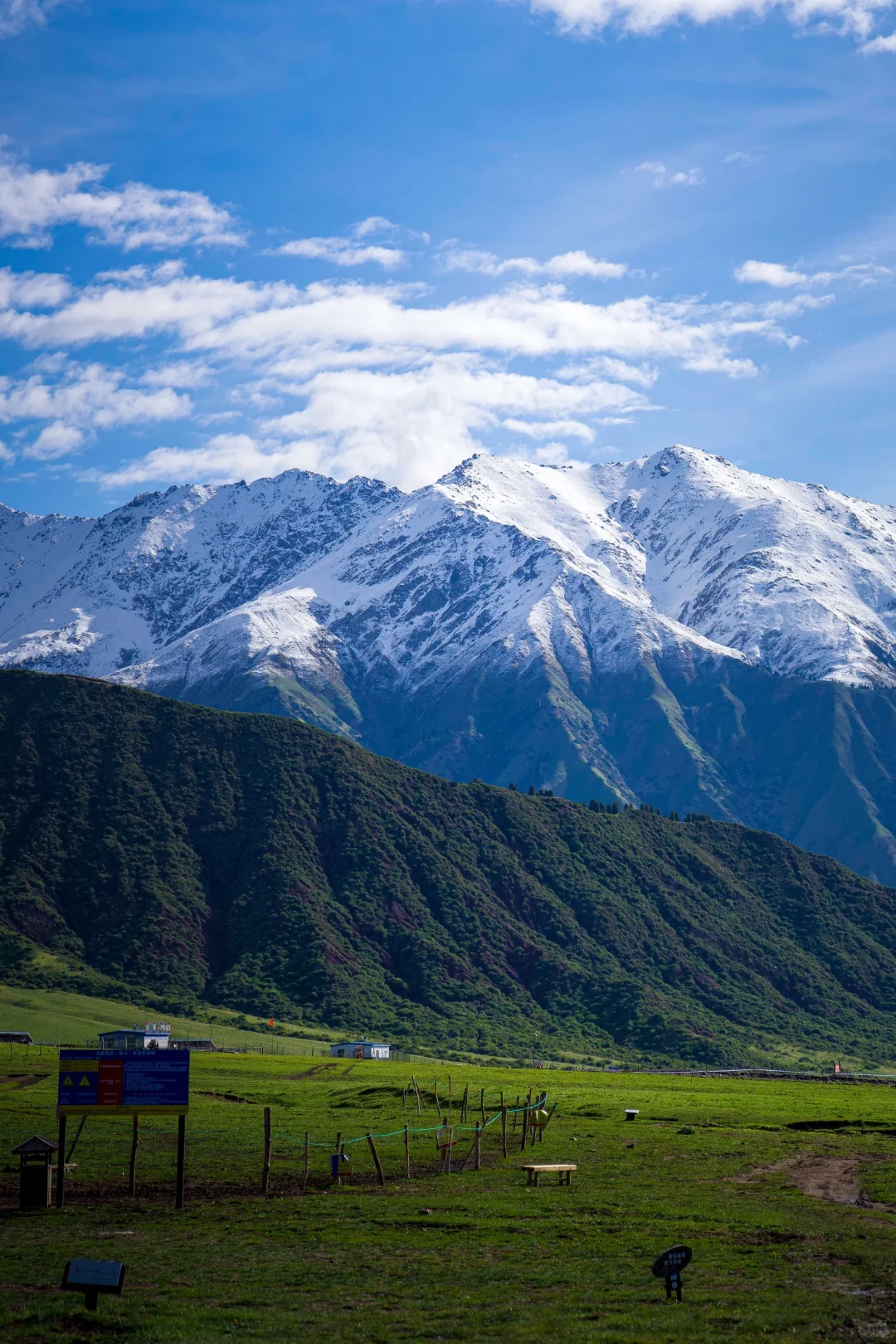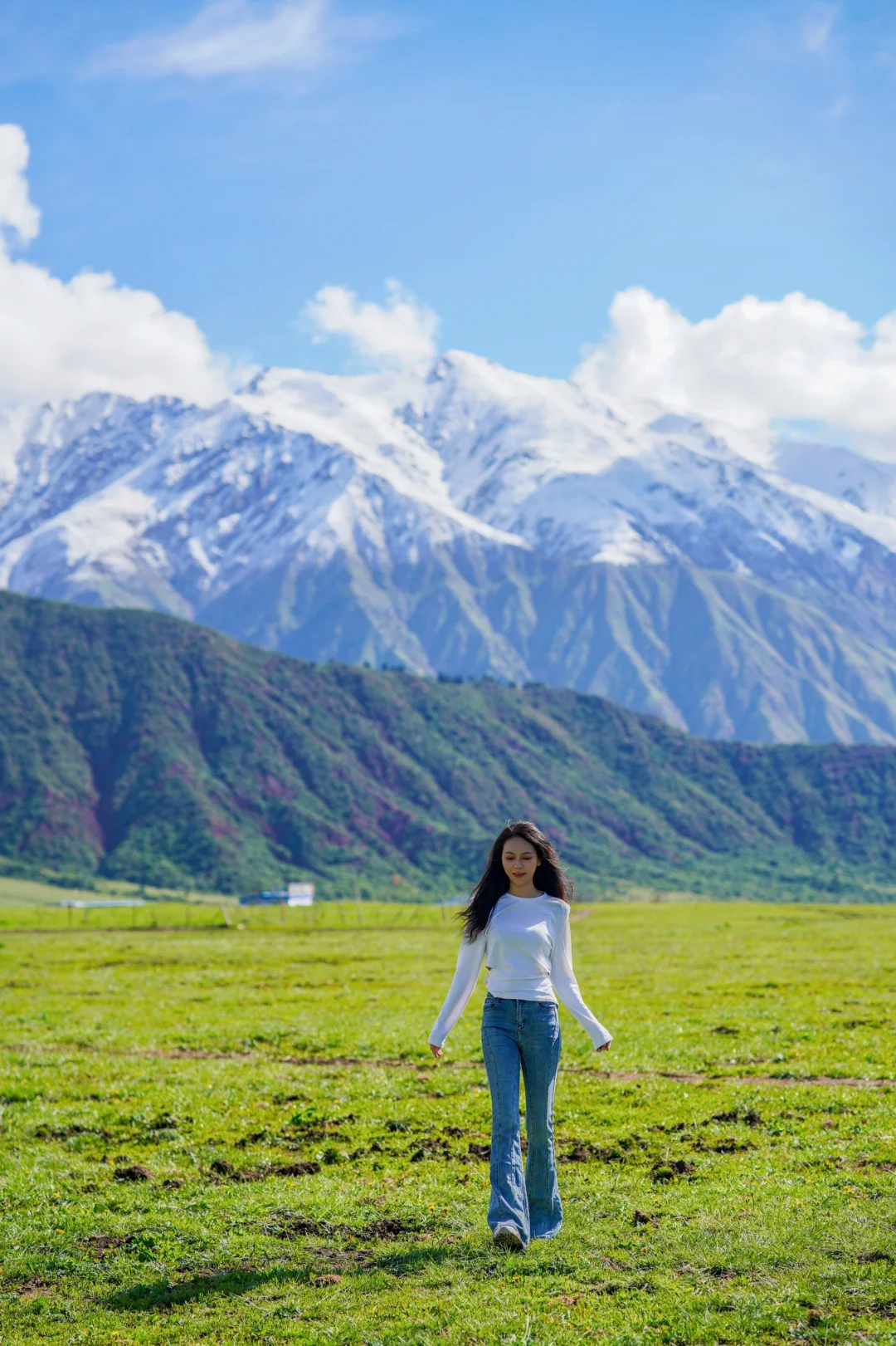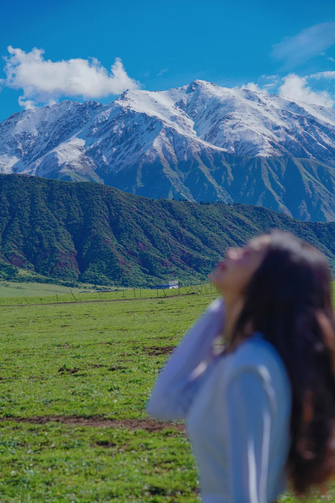 在塔村可以看到雪山在远方矗立,翠绿的草原被青山环抱,绵延天际,这一刻的心情真的无比的放松!仿佛油画般的风景里,慵懒的马群羊群吃草,山青云高岁月静好。而眼前的雪山好像是触手可及般的美好又神圣。