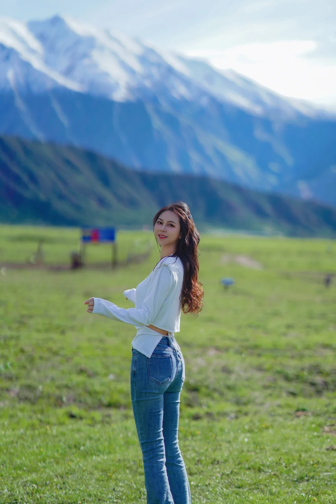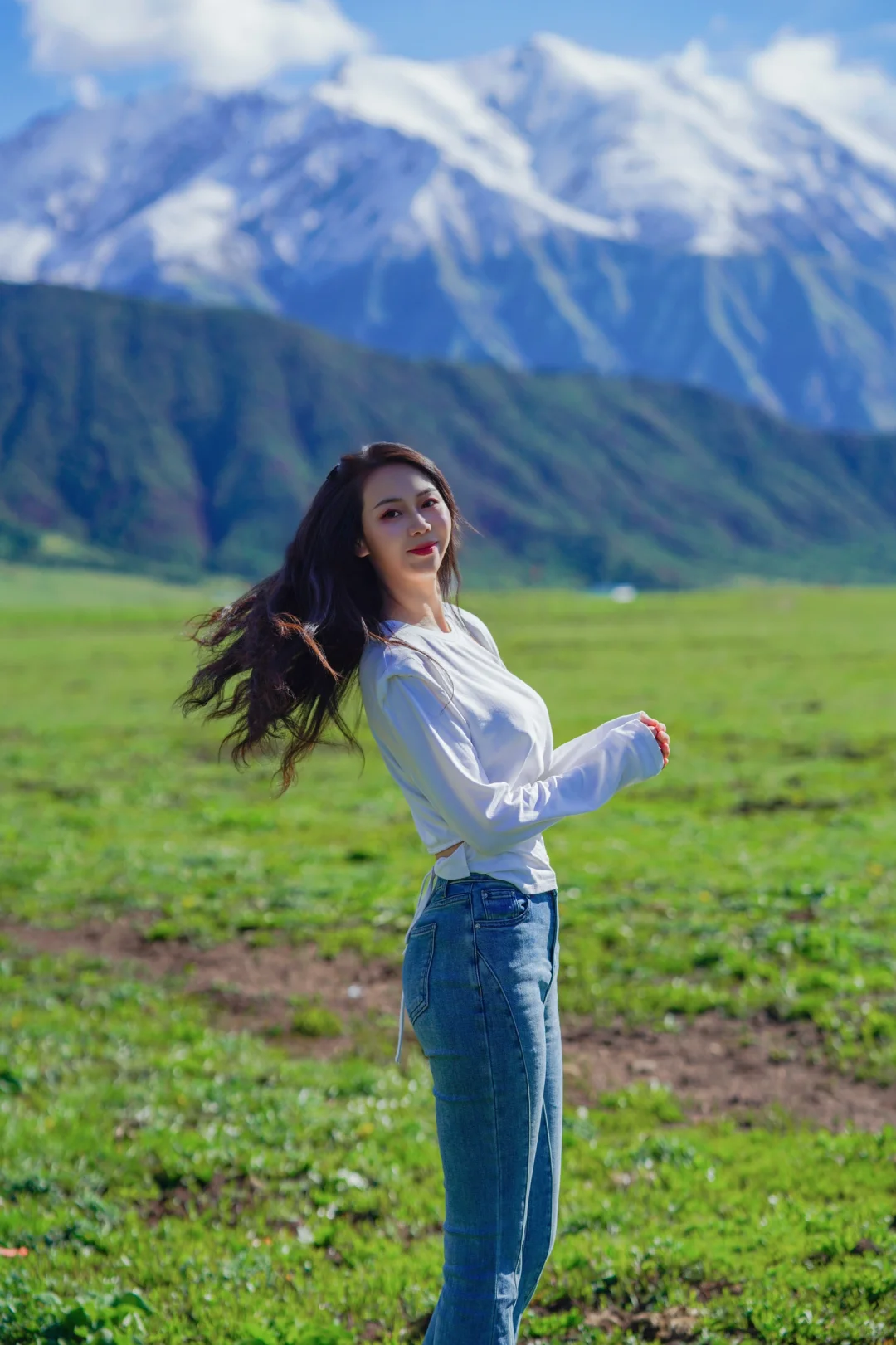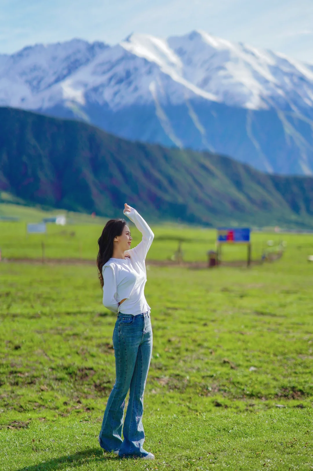 在塔村可以看到雪山在远方矗立,翠绿的草原被青山环抱,绵延天际,这一刻的心情真的无比的放松!仿佛油画般的风景里,慵懒的马群羊群吃草,山青云高岁月静好。而眼前的雪山好像是触手可及般的美好又神圣。