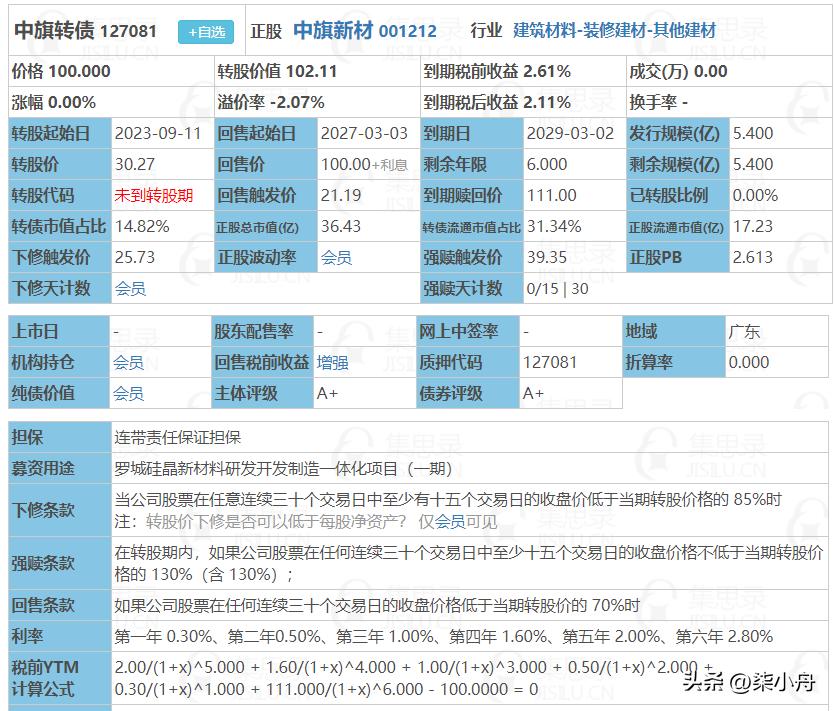 中旗转债将于3月3日开启申购。根据当前市场情绪及可转债交易行情,中旗转债上市时预计会有17%的溢价,预计上市价值为119.47元。 中旗转债为A+级转债,目前转股价值较高,正股盈利能力尚可,纯债价值较低,建议顶格申购。#可转债打新#