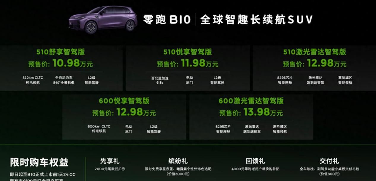 最后,让我们再次回顾一下零跑B10的关键数据:预售价10.98万元-13.98万元,搭载激光雷达,CLTC续航里程510km/600km,最大功率160kW,最大扭矩240N·m,百公里加速时间6.8s。 这些数据,或许能够帮助你更好地了解这款车型。