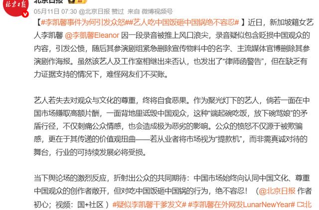 在报道中直面对于此事进行评价,艺人若失去对观众与文化的尊重,终将自食恶果。