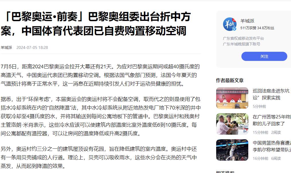 法国不给,我们自己装!近日,巴黎奥委会以“环保”为名,拒绝在奥运村内安装空调,要知道,再过几天巴黎的温度将达到40摄氏度,为此我国体育代表团不得不自费购置移动空调带往法国。 (信息来源:羊城派 巴黎奥运前奏 巴黎奥组委出台折中方案,中国体育代表团已自费购置移动空调) 本届巴黎奥运会,注定将载入史册,因为它是主办方首次连空调都要省了! 而据气象台的预报,今年法国的夏天会出奇的热,巴黎的气温将飙升至40摄氏度,这意味着,没有空调,运动员们将在简配的奥运村内“蒸桑拿”。 面对各国参赛者的抗议,巴黎给出的解释竟然是一切为了环保考虑。为了证明自己并不是“抠”,他们还耗费重金,打造了一套所谓的“自然降温”程序。将冷却至4摄氏度的水灌输进管道,然后铺在每间奥运公寓的地板下,从而达到降温的目的。 用巴黎奥运村负责人的话说,这样做,可以让室温比外面低足足6-10摄氏度,简言之,如果外面酷暑难耐,是40°的话,那么里面最低也才30°,不得不说,巴黎奥委会“有心”了! 除了空调简配外,法国的各大比赛场馆也是一言难尽。因为本地人性子慢,再加上时不时大罢工,使得定好的项目一次次延期。距离开幕式不到一个月了,好多工地上还矗立着一台台吊车。于是,法国政府决定,只要原来的场馆设施不坏就凑合用吧,总比没有强。 在食物上,就更是滑天下之大稽了,为了缩减预算,法国奥运期间,准备的食材四个字就可以概括“菜多肉少”。说好听点,叫支持环保,但实际上就是抠门。为此,网上早有人预言,本届奥会员,各国将自带美食前往参赛,毕竟高强度的竞技吃饱是前提。 由于塞纳河的清污工作很不乐观,再加上巴黎市民的不配合,目前,河水里漂浮着大量排泄物,作为奥运的经典项目,铁人三项被迫改为了铁人两项,只因为水中的大肠杆菌超标已经到了令人发质的地步! 可即便如此,要想完成,也是一次巨大的考验,估计除了印度选手有“故地重游”的感觉外,其他各国的运动员恐怕是胆汁都吐出来了。 试想一下,当运动员们忍着恶臭,在粪水里赛完后,拖着一身疲惫,回到30度的屋子,那感受,绝对骂娘的心都有了! 也许正是考虑到了这点,巴黎奥委会还贴心的在奥运村内铺设了一条“贝壳人行道”,按照法国政府给出的解释,贝壳具有吸水性,当天气炎热时,会释放出大量的水份,从而达到降温增湿的效果。 当然了,如果不尽兴,还可以欣赏屋顶的花园。本次巴黎奥运村三分之一的建筑都会加装花园屋顶,官方给出的依旧是,可以有效降低房间内的温度。 纵观巴黎奥委会的做法,就好比掏着大把的钱,购买了一堆过期,无法下咽的食材,然后强行混在一起做成食物,邀请世界各国友人来家里做客。 对于如此奇葩的行为,不仅亚洲国家,就连英国、德国等同为欧洲阵营的兄弟们也选择了“背刺”,大家纷纷表示,不就是空调嘛,你不给,我自己带!最终,巴黎奥委会也妥协了,提出折中的办法,允许各参赛国自行出资购买并安装便携式空调。 因为上述的吐槽、打脸。法国奥运会虽然还没开始,就已经被全球网友当做茶余饭后的乐子,肆意调侃。如果还这么扣下去,不作为,这届奥运员注定将绑在历史的耻辱柱上。