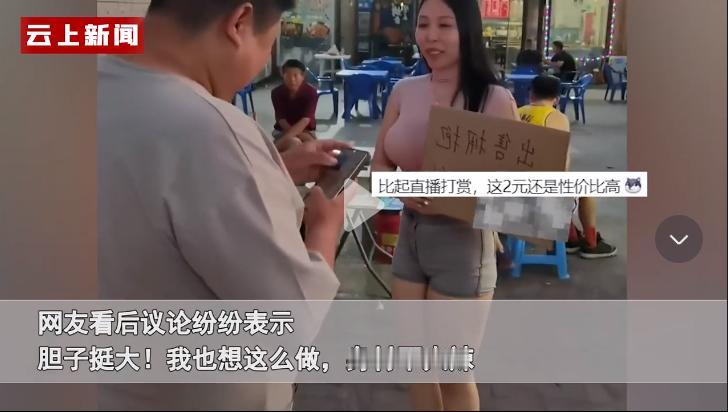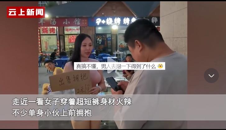 世风日下!河北街头,大胸女子当街售卖拥抱,2元一次,排队者络绎不绝!甚至为了吸引客人,她故意一身清凉装扮,超短裤搭紧身T恤,看得人鼻血都下来了。就连一些已婚男人都忍不住上去尝试... (信息来源:云上新闻(2023-06-30)——《女子当街售卖拥抱一次2元,谁料生意火爆众人排队,一看身材秒懂》) 这天傍晚,河北某条街上突然沸腾了起来,只见人群中,一漂亮女孩手举着“拥抱,2元一次”的牌子,风情万种的站在那里。 她叫思佳,天生丽质,笑容可亲,一头飘逸的秀发将凹凸有致的身材衬托的魅力十足。期间,一些单身男青年小心翼翼道:“2块就能抱一次,真的假的?”在得到肯定答复后,旁边的路人,连忙加入了排队大军。 毕竟,在如今一杯咖啡都要20块的年代里,只需十分之一就可以与美人拥抱,简直划算到家了。很快,这道独特的风景线引起了一些女性的注意,她们发现自己的老公竟也在其中,看得津津有味,于是愤怒的一把拽走自家男人。 一会的功夫,街头出现了一条蜿蜒曲折的队伍,其中不少人拿出手机,打开闪光灯,女孩自信、爽朗的笑容,让街拍爱好者忍不住现场作业,对着她的身材,不断按着快门。“噼里啪啦”的声响,此起彼伏。 隔天,她身着紧身包臀,售卖拥抱的图片就被放在了网上。一时间,引爆各大论坛。 对此,思佳也做出了回应:“上学的时候欠了不少外债,我也想过做其他工作,可惜学历和阅历有限,并没有太多其他选择。” 面对一些人的质疑,她泪眼婆娑道:“我知道我现在的做法可能会让一些人感到不适,但是,我真的很需要钱啊...” 此话一出,网友们当即开始站队。赞成者认为,女孩的创业方式新颖、大胆,且不有伤风化。2块钱一次,也能满足底层百姓的消费能力,她漂亮的外形,热情的服务态度,可以帮助单身青年获得片刻的安慰,打破人与人之间的隔阂和冷漠。 但在反对者看来,拥抱是人表达感情的方式,不应该被商业包装,大肆售卖。长此以往,会玷污人类最原始的精神需求,促使这个社会愈发的功利、冷漠。而且,女孩的穿着和行为,涉嫌出卖色相,当街与陌生男人亲密互动,故意展示自己的大胸更不利于家庭和谐,因此建议叫停。 其实,这两种观点都是足以令人深思的。今天社会竞争日益激烈,人与人之间的情感却在慢慢降温。思佳的行为之所以会引起大众热议,主要是拥抱,可以促进异性间的安慰,给予鼓励,在这个世界上,还有很多比钱更重要、更值得我们追求的东西。 而女孩的行为,还涉及到一点,那就是新生事物出现时,总会伴随着争议。因为它打破了传统认知,甚至是颠覆了某个行业的规则,遇到此种情况,正确的做法应该是:在不违背法律、公序良俗的前提下,积极引导,鼓励,而不是一棍子打死,墨守成规。 (文中人物均为化名)