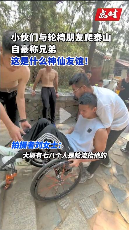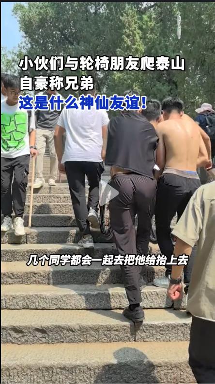 这才是兄弟!山东泰安,一女人爬泰山,累的双腿发颤,突然,身后传来一阵惊呼,扭头一瞧,只见4个壮小伙抬着一个轮椅,上面坐着一位男子,正常爬都累的够呛,更别提抬轮椅了!女子不解:“你们是朋友吗?”岂料,小伙子们的回答感动了在场所有人。 (信息来源:点时新闻《7月11日,山东泰安,几位小伙伴带轮椅朋友爬泰山,并自豪称“我们是兄弟!”》) 人生在世,最惬意的莫过于有几个知根知底的好兄弟! 三年前,马先生遭遇了一场意外,事后被迫坐上轮椅,那段日子,他度日如年。原来,他从小就是位登山爱好者,梦想就是和兄弟们走遍祖国的大好河山,在峰顶俯瞰人间,享受自然的美好。只可惜,这一切全都随着双腿残缺戛然而止了。 没成想,就在此时,一群熟悉的身影出现了。听到马先生出事后,兄弟们连夜购买了装备,制定了爬山计划,哪怕用手抬,也要帮朋友实现心中的夙愿。 “不为别的,谁让咱们是兄弟呢!”对于好哥们的解释,马先生以热泪作为回应。 当天,一行人来到了泰山脚下,抬头眺望其巍峨的景观,不禁被蜿蜒陡峭的台阶所震撼。尤其是,高耸入云的“南天门”,仿佛建在云彩里。 尽管前路艰难,充满挑战,但众人并未被吓倒,他们微笑着抬起好兄弟,大踏步开始攀登。很快,他们的模样引起了路人的注意,有人掏出手机开始拍照,还有人在低声窃语。 随着台阶越来越抖,大伙肩上的重量已经突破了极限,达到了200多斤。但他们并未停歇,而是咬牙继续。衣襟湿透,额头渗出汗珠,互相勉励,继续攀爬。只因为心里装着兄弟,装着一辈子的友谊,给个金山都不换! 很快,旁边的游客被他们的情谊打动了,纷纷让出路,开始加油鼓劲。还有的,在身后大声呼喊:“好样的,小伙子们,真棒!” 台阶一层接一层的被征服,远处的南天门也越来越近,此时,距离上山已经过去了足足6个小时。轮椅上的马先生早已泪流满面,他激动的眺望着远方的景色,脑海中回忆着和兄弟们相处的点点滴滴。 终于,抵达终点了!当马先生被搀扶着站在最后的台阶上时,心里瞬间燃起了对未来的憧憬,连日来的阴云一扫而空。这一刻,兄弟八人开怀大笑,在这泰山顶上,享受着成功的喜悦,见证着几人的友谊创造了奇迹! 未来,他们还将一同游遍大江南北,看尽祖国的壮丽山河,虽然马先生腿脚不便,可只要有兄弟四个在,一切都不是问题。好兄弟,就是在关键时刻,愿意做你的拐杖,为你撑起那片即将塌下的天! 和万古长存的友谊相比,即便是雄浑的泰山也有些渺小,希望五兄弟的情谊能感动更多的人,激励我们重新去拾回丢失的宝贵记忆!