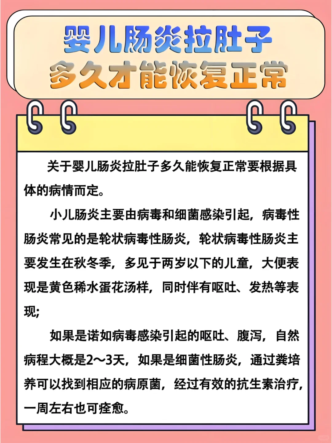 关于婴儿肠炎拉肚子多久能恢复正常要根据具体的病情而定。婴儿肠炎主要有病毒和细菌感染引起,病毒性肠炎常见的是轮状病毒性肠炎,轮状病毒性肠炎主要发生在秋冬季,多见于两岁以下的儿童,大便表现是黄色稀水蛋花样,同时伴有呕吐、发热等表现。