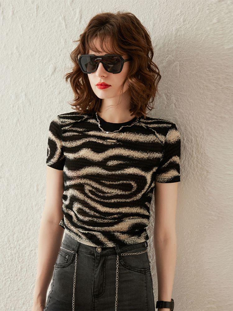 白鹿语斑马纹,夏日新宠,复古个性圆领短袖,时尚修身上衣,展现你的独特韵味。