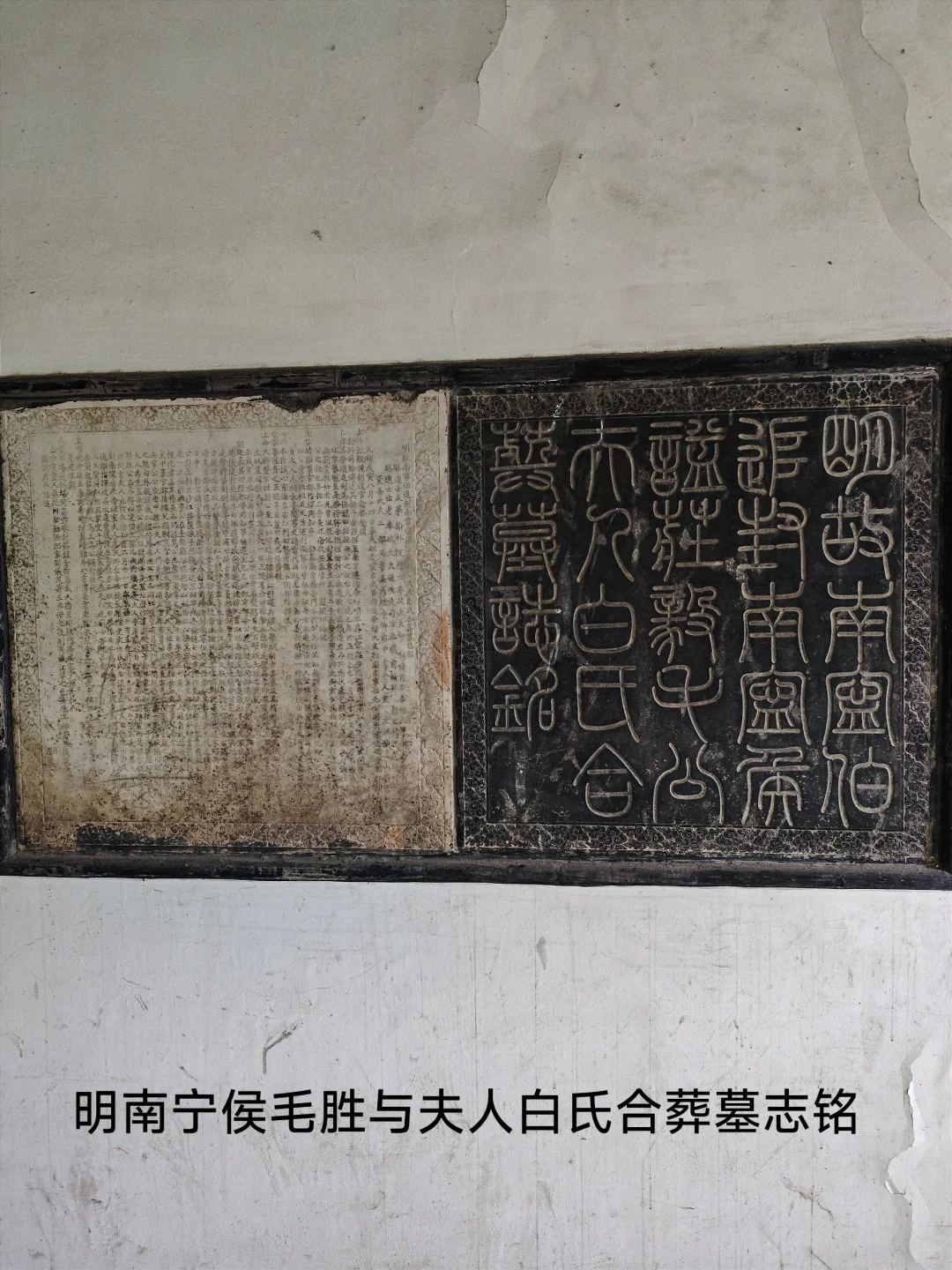 毛胜墓神道残存的一对石羊,在修葺邓愈墓时,迁移至墓园东侧的石刻园内。毛胜墓志铭也展示在邓府山石刻园西廊。