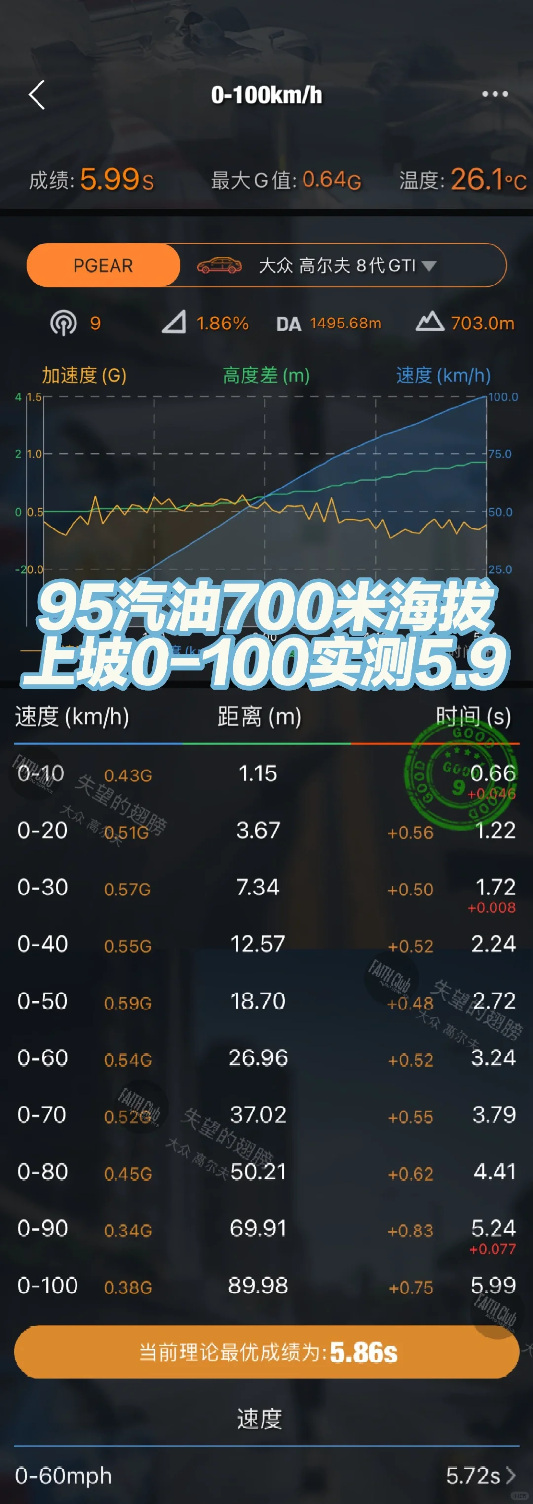 合作店家GTI8 23款: MA Performance一阶, 220P/350NM->300P/430NM, 95汽油700米海拔还是个上坡, 0-100 7.2->5.9带GPF的确实慢…