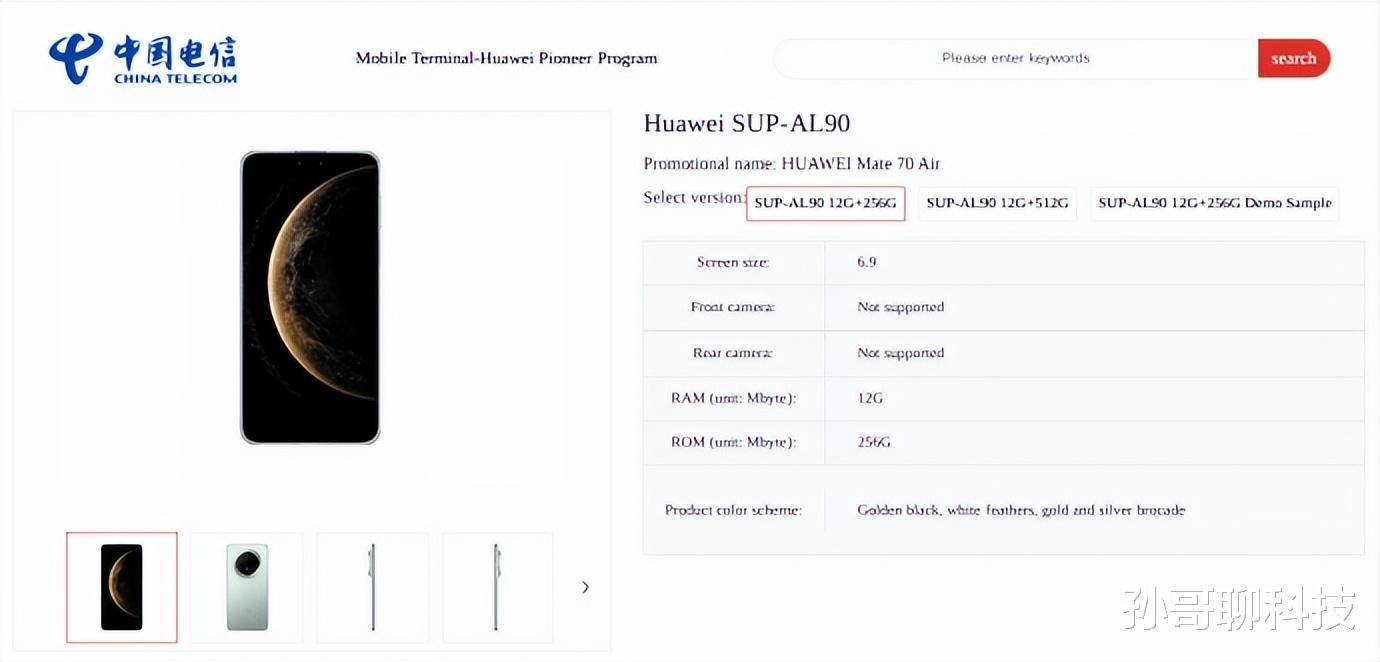 根据电信终端产品库信息显示,华为Mate70 Air型号为“SUP_AL90”,同时公布了外观设计。这款手机依旧采用居中大圆影像模组,和华为Mate70系列设计没有区别,正面为6.9英寸大屏,提供12+256GB、12+512GB两个版本,出厂预装HarmonyOS 5系统,预计麒麟9010系列处理器。