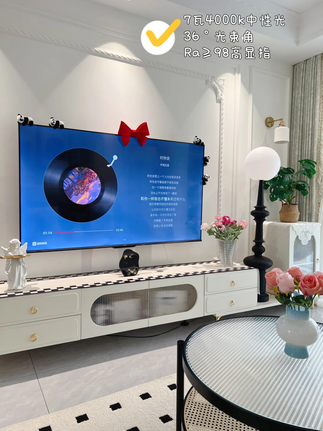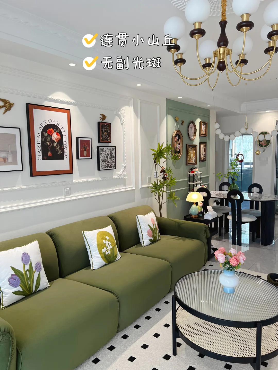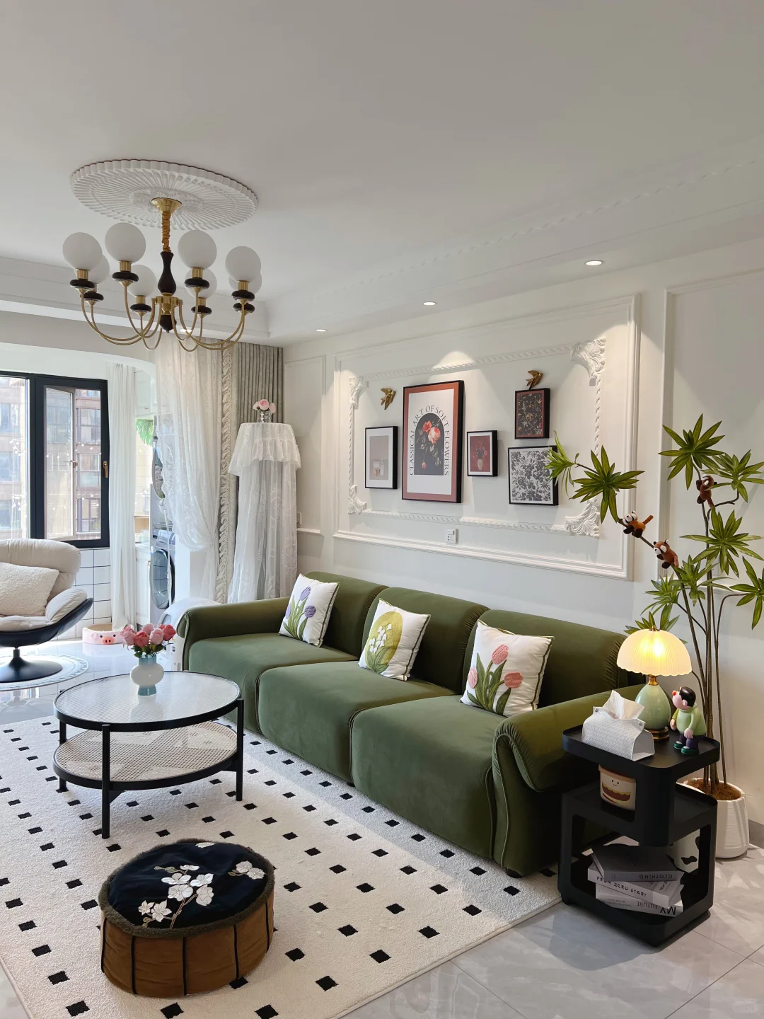 花光积蓄买了个90平的小房子 没钱装修就刷攻略自己装 温馨浪漫的法式风当然是首选 整个硬装都是线下入手,花费12万 客餐厅一体,开间3.5米,只有20多平 珍珠白乳胶漆通刷搭配石膏线造型 简单的双眼皮吊顶和拱门设计 射灯打开,连贯的小山丘打到墙上 浪漫的法式的氛围感直接拉满 射灯不仅可以提升氛围感 还是很好的辅助灯源 我家选的是7瓦4000k的中性光 光束角36°,边缘清晰又没有副光斑 开灯后的洗墙效果真的绝了 软装搭配硬装,以黑白绿三色为主 整体风格偏法式复古风,非常高级 房子虽小,但和法式风装修真的很配啊