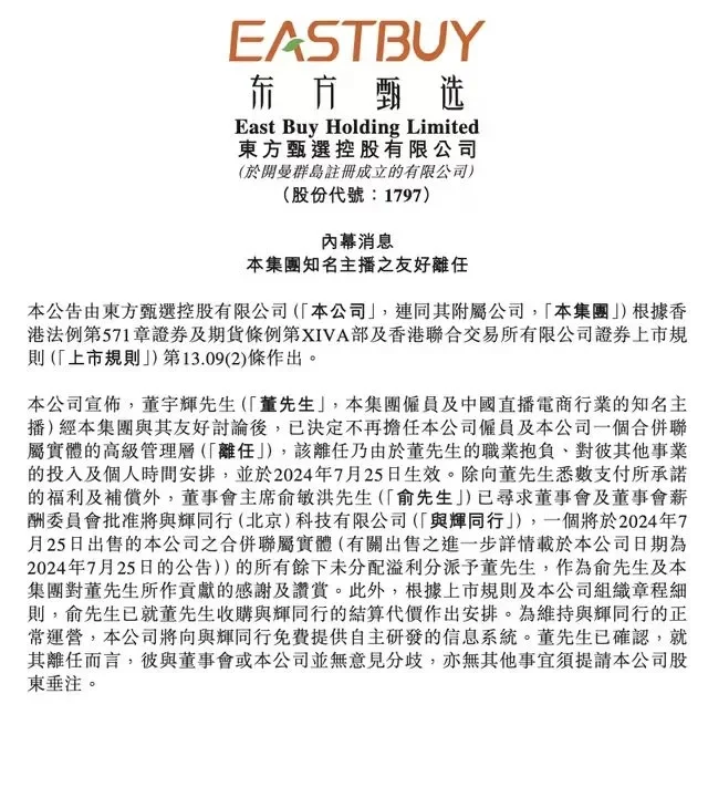7月25日,东方甄选在港交所公告,董宇辉已决定不再担任公司雇员及公司一个合并联属实体的高级管理层,该离任乃由于董宇辉的职业抱负、对彼其他事业的投入及个人时间安排,并于2024年7月25日生效。除向董宇辉悉数支付所承诺的福利及补偿外,董事会主席俞敏洪已寻求董事会及董事会薪酬委员会批准将与辉同行的所有余下未分配溢利分派予董宇辉。此外,根据上市规则及本公司组织章程细则,俞敏洪已就董宇辉收购与辉同行的结算代价作出安排。为维持与辉同行的正常运营,公司将向与辉同行免费提供自主研发的信息系统。