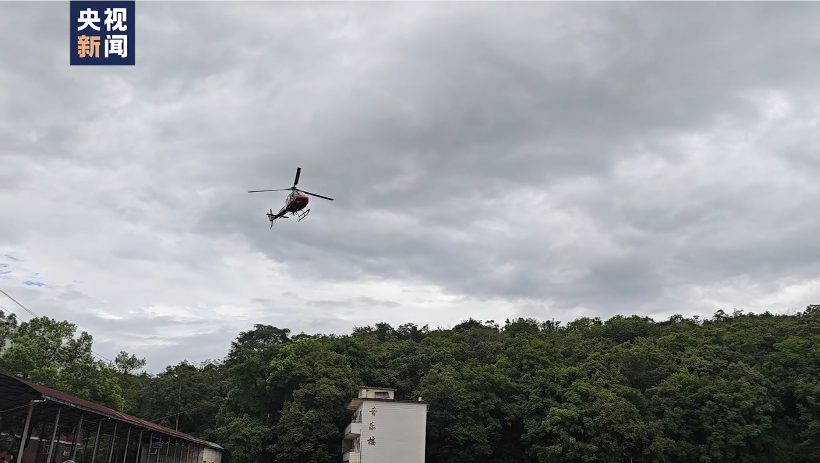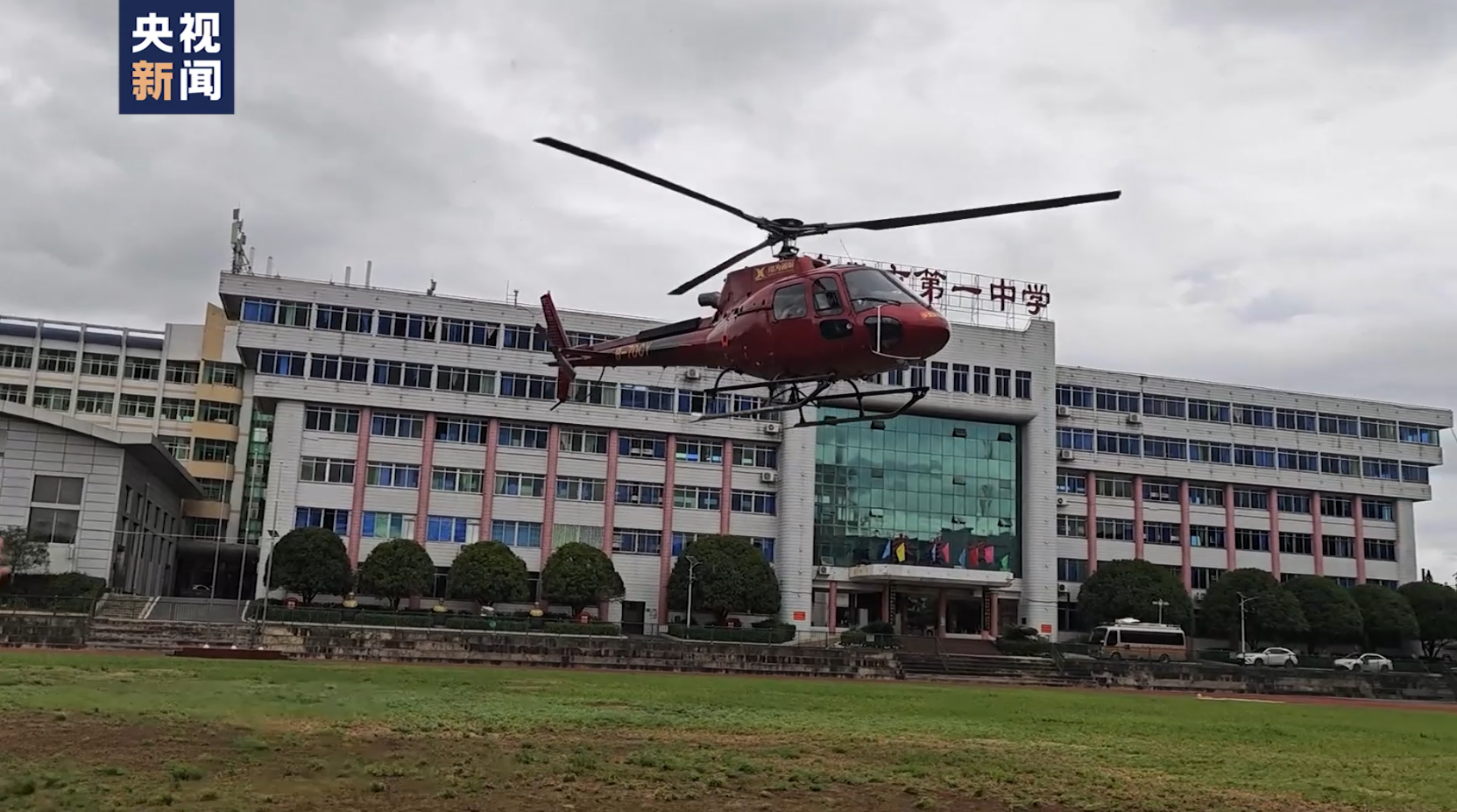今天(7月31日)10:40,一架救援直升机从资兴市一中起飞,前往八面山瑶族乡田坪村,那里有一名孕妇和一名老人,急需送医治疗。