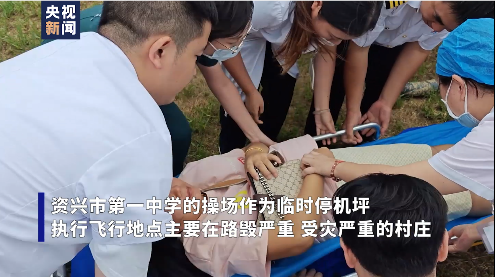 资兴市第一中学的操场作为临时停机坪,两侧放着救援物资,直升机正在执行物资及伤员转运工作,执行飞行地点主要在路毁严重、受灾严重的村庄。