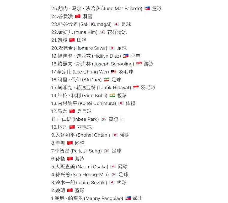 亚洲25大运动员出炉!
