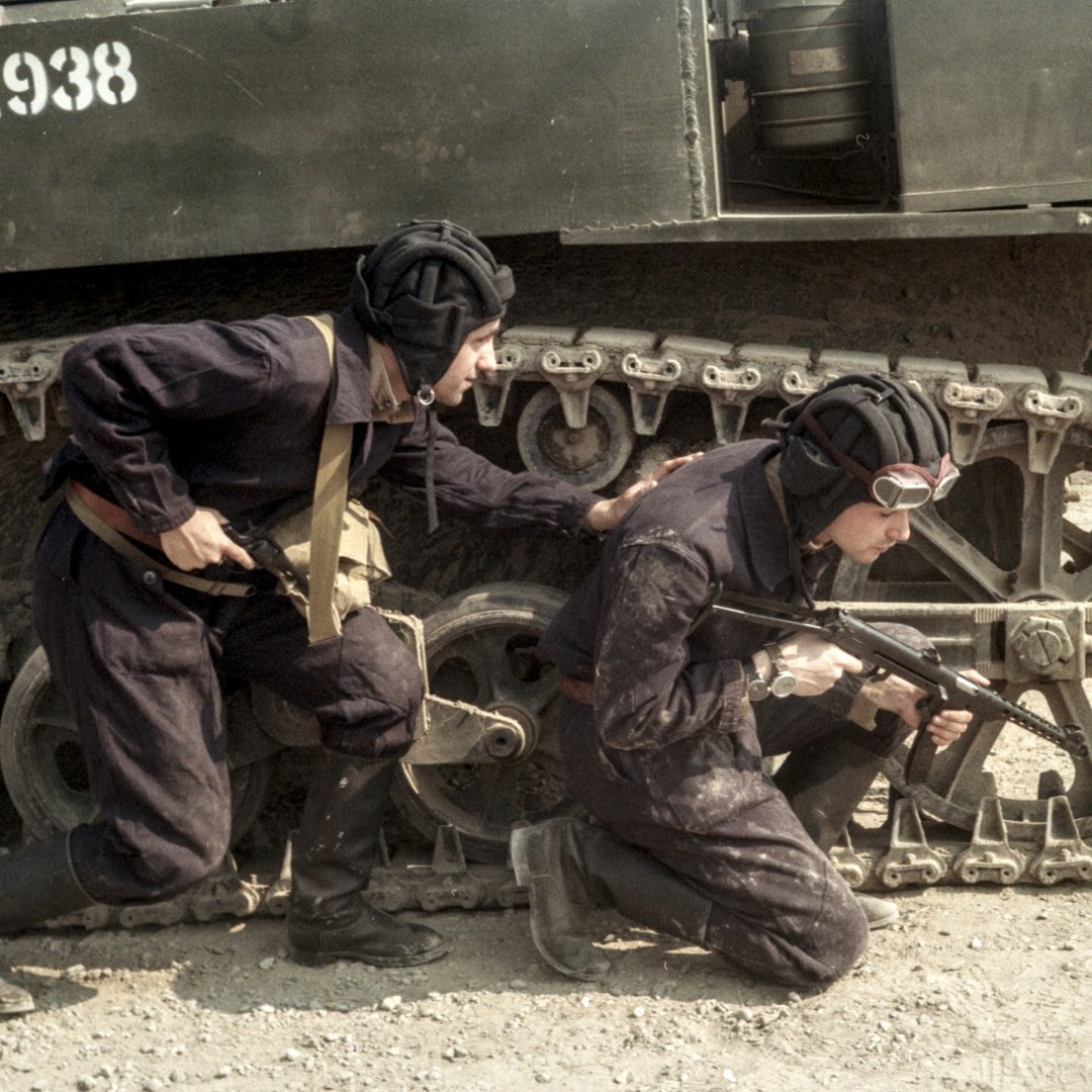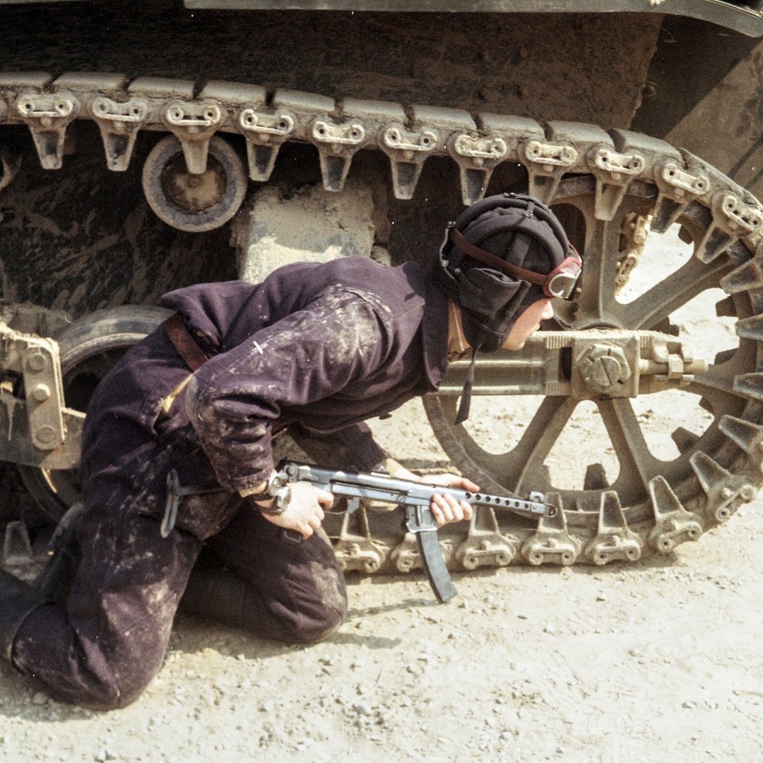 重演照片,还原坦克被击中起火后,两名坦克兵掩护受伤战友从车上撤离,一个车组通常配有一把纳甘转轮和一把波波斯,通常车上还会有一袋手榴弹