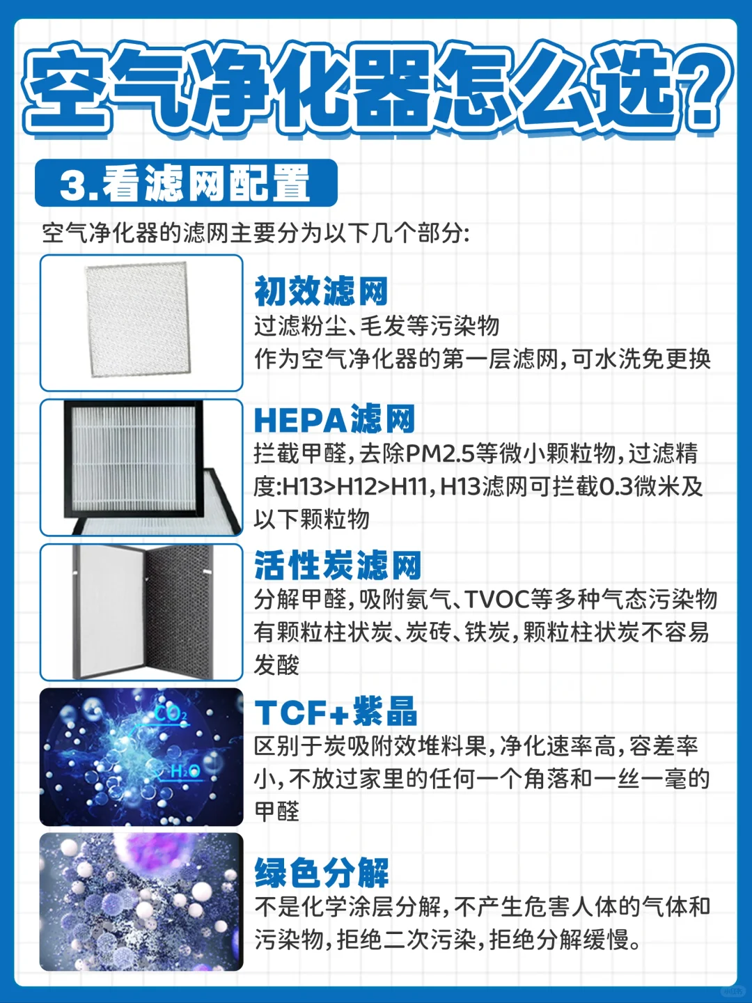 空气净化器的滤网主要分为初效滤网、HEPA滤网,活性炭滤网、TCF+紫晶和绿色分解