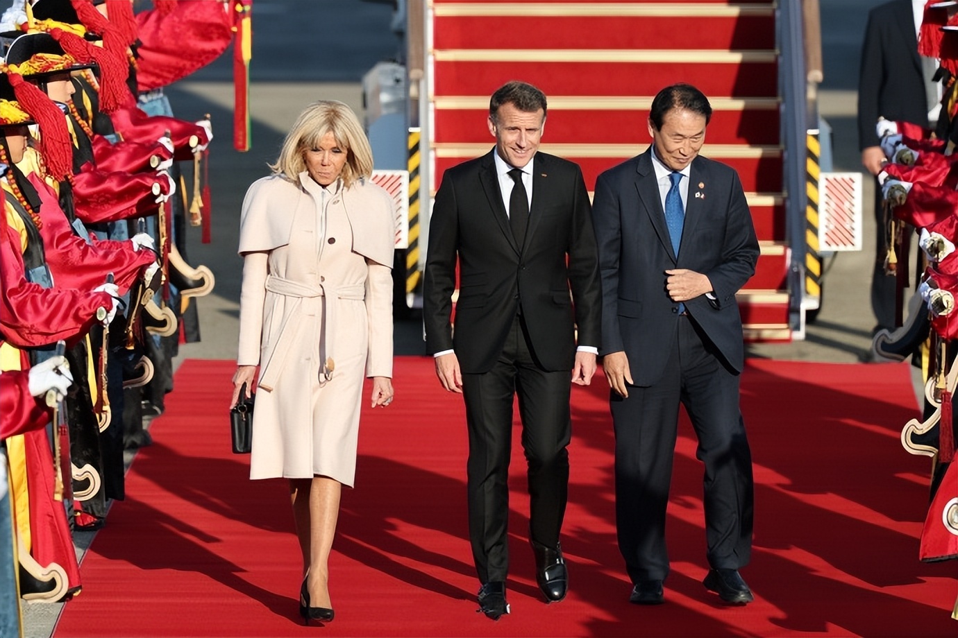当然了韩国还给马克龙和夫人准备了高规格的欢迎仪式,在迎接现场,不仅有红毯铺地,还有仪仗队欢迎,而这些仪仗队还穿古装给人的仪式感满满,估计这也是韩国迎接国外贵宾的最高礼节吧!只是韩国总统李在明没有亲自过来,也许法国夫人布里吉特知道韩国第一夫人颜值高,气质优雅,所以法国第一夫人刚来韩国直接就放了大招。不仅衣服美感十足,就连衣服的气场也是非常在线。