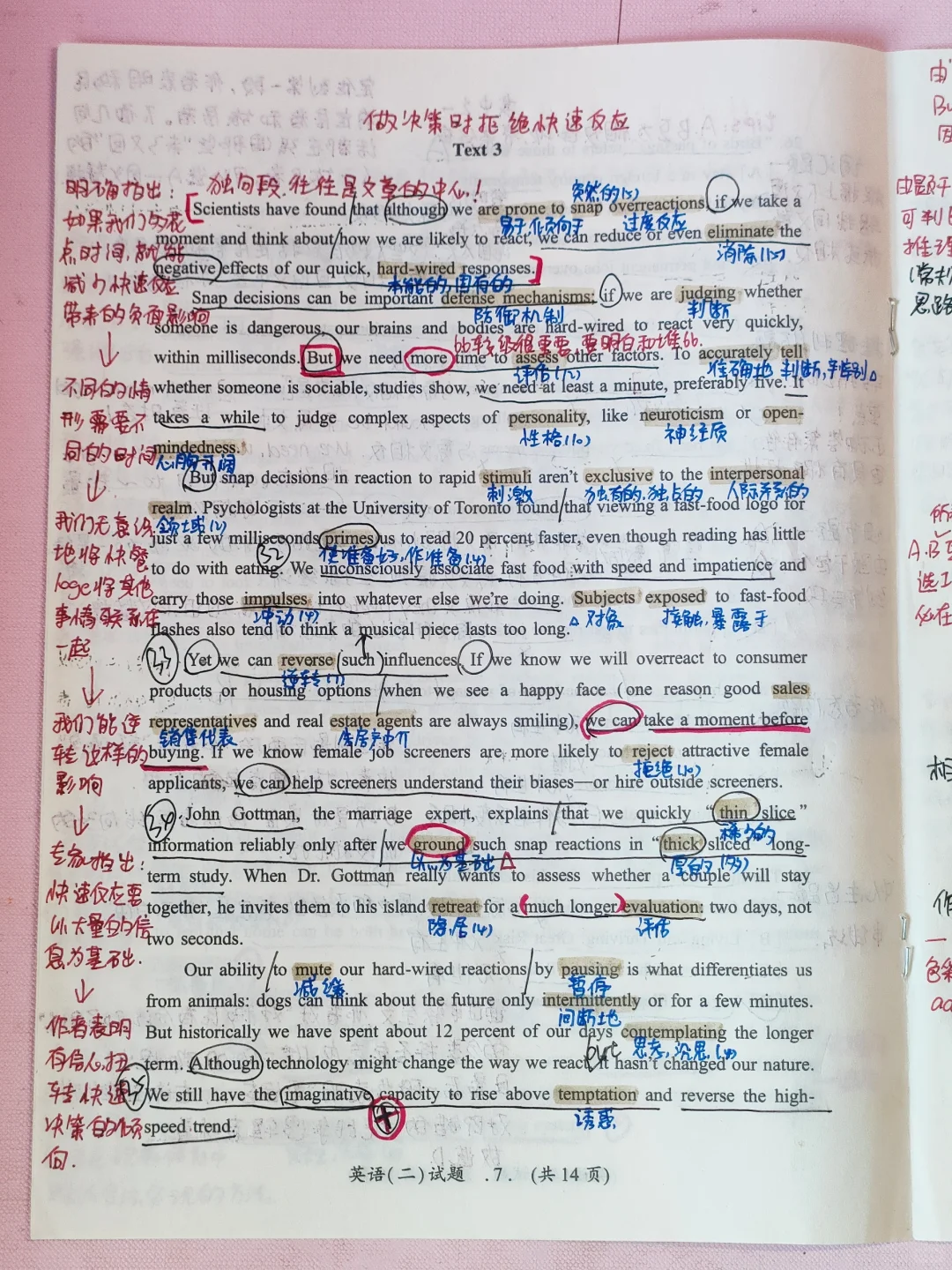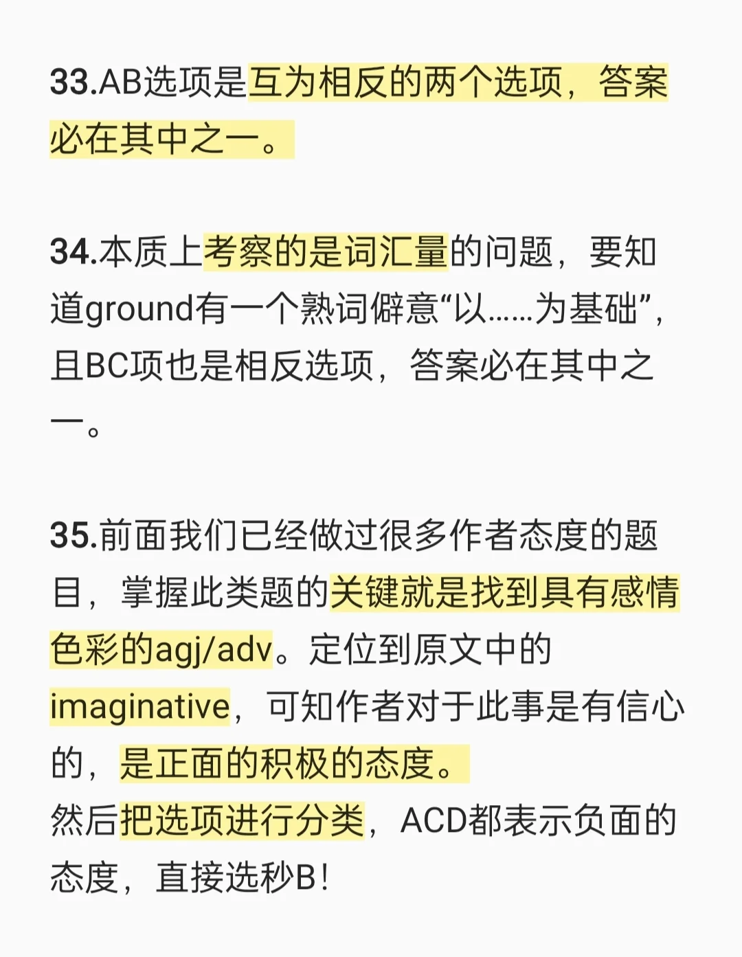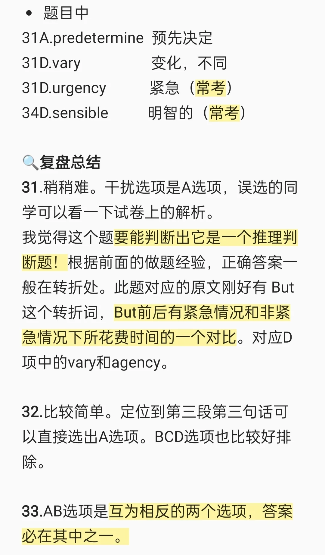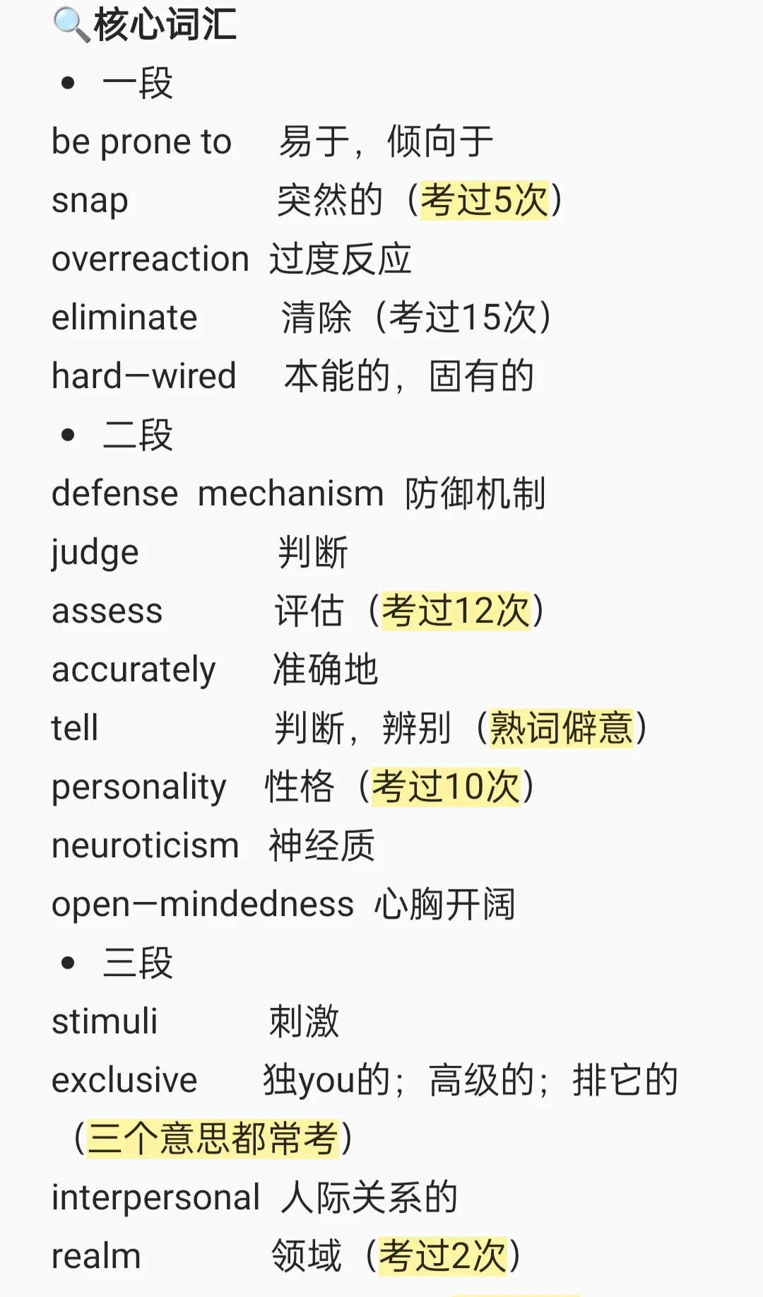 🔍核心词汇 💛一段 be prone to     易于,倾向于 snap                突然的(考过5次) overreaction  过度反应 eliminate         清除(考过15次) hard—wired     本能的,固有的 💛二段 defense  mechanism  防御机制 judge               判断 assess            评估(考过12次) accurately      准确地 tell                   判断,辨别(熟词僻意) personality    性格(考过10次) neuroticism   神经质 open—mindedness  心胸开阔 💛三段 stimuli            刺激 exclusive       独you的;高级的;排它的(三个意思都常考) interpersonal  人际关系的 realm              领域(考过2次) prime              使准备好(考过4次) impulse          冲动(考过4次) subject           对象(熟词僻义) expose           接触,暴露于 💛四段 reverse           逆转(考过7次) representative  代表 estate agent  房产中介 reject            拒绝(考过10次) 💛五段 thin                薄的,少的 thick              厚的 ground…in    以……为基础(熟词僻义) 🌷字数限制,剩下的核心词汇看图哈~ —— 🔍复盘总结 [三R][一R].稍稍难。干扰选项是A选项,误选的同学可以看一下试卷上的解析。 我觉得这个题要能判断出它是一个推理判断题!根据前面的做题经验,正确答案一般在转折处。此题对应的原文刚好有 But 这个转折词,But前后有紧急情况和非紧急情况下所花费时间的一个对比。对应D项中的vary和agency。 [三R][二R].比较简单。定位到第三段第三句话可以直接选出A选项。BCD选项也比较好排除。 [三R][三R].AB选项是互为相反的两个选项,答案必在其中之一。 [三R][四R].本质上考察的是词汇量的问题,要知道ground有一个熟词僻意“以……为基础”,且BC项也是相反选项,答案必在其中之一。 [三R][五R].前面我们已经做过很多作者态度的题目,掌握此类题的关键就是找到具有感情色彩的agj/adv。定位到原文中的imaginative,可知作者对于此事是有信心的,是正面的积极的态度。 然后把选项进行分类,ACD都表示负面的态度,直接选秒B!