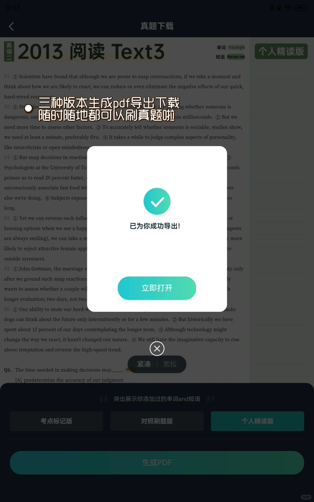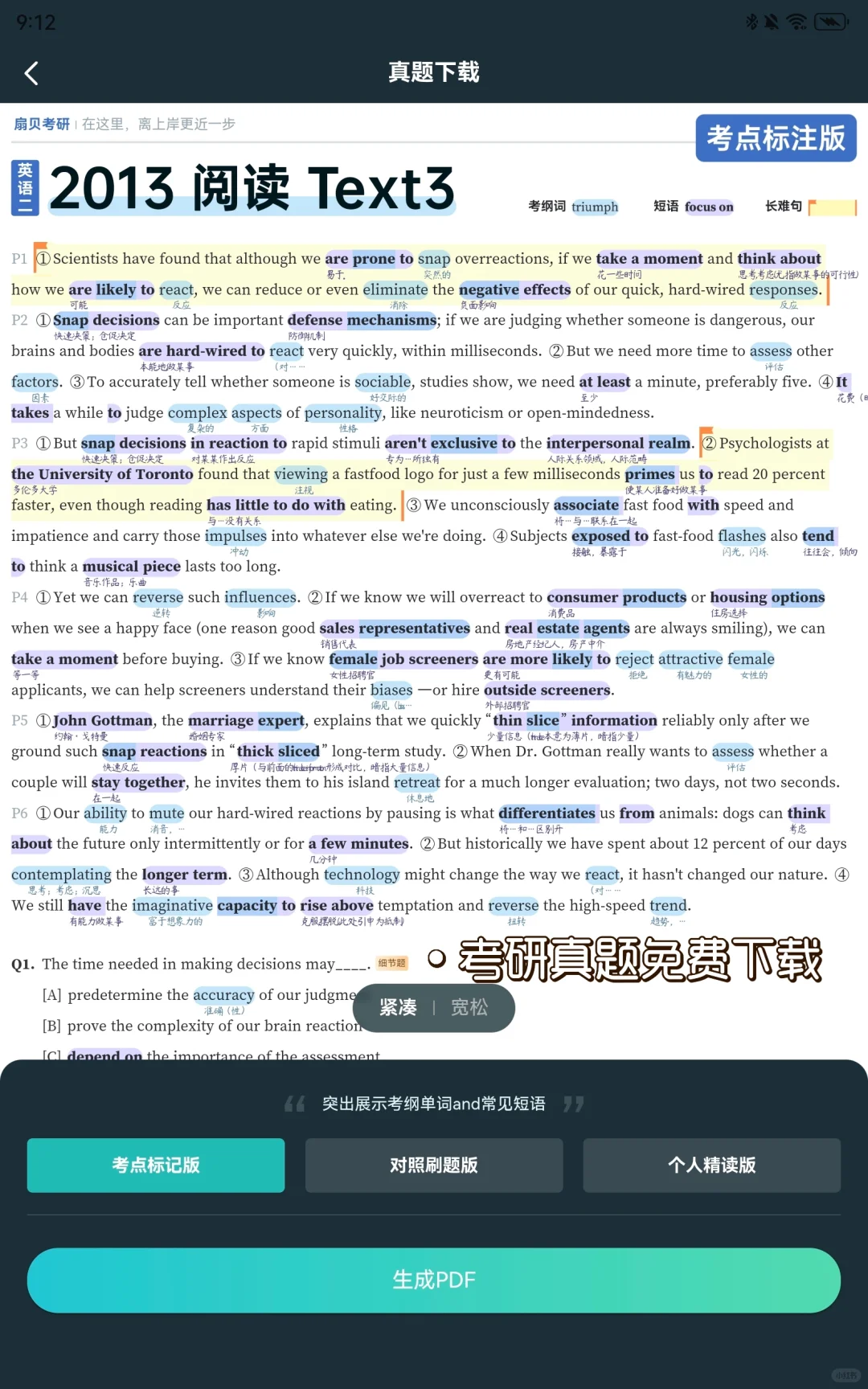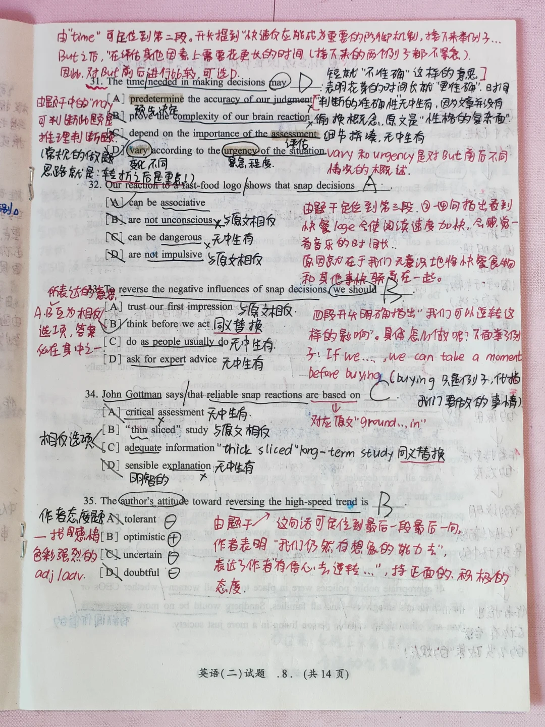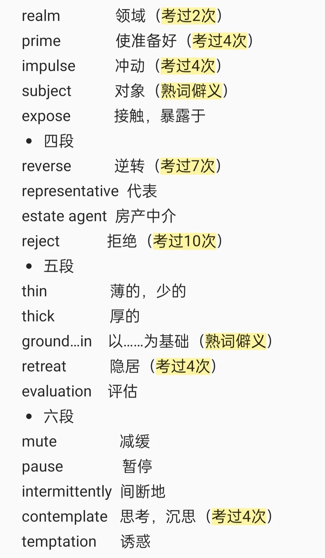 🔍核心词汇 💛一段 be prone to     易于,倾向于 snap                突然的(考过5次) overreaction  过度反应 eliminate         清除(考过15次) hard—wired     本能的,固有的 💛二段 defense  mechanism  防御机制 judge               判断 assess            评估(考过12次) accurately      准确地 tell                   判断,辨别(熟词僻意) personality    性格(考过10次) neuroticism   神经质 open—mindedness  心胸开阔 💛三段 stimuli            刺激 exclusive       独you的;高级的;排它的(三个意思都常考) interpersonal  人际关系的 realm              领域(考过2次) prime              使准备好(考过4次) impulse          冲动(考过4次) subject           对象(熟词僻义) expose           接触,暴露于 💛四段 reverse           逆转(考过7次) representative  代表 estate agent  房产中介 reject            拒绝(考过10次) 💛五段 thin                薄的,少的 thick              厚的 ground…in    以……为基础(熟词僻义) 🌷字数限制,剩下的核心词汇看图哈~ —— 🔍复盘总结 [三R][一R].稍稍难。干扰选项是A选项,误选的同学可以看一下试卷上的解析。 我觉得这个题要能判断出它是一个推理判断题!根据前面的做题经验,正确答案一般在转折处。此题对应的原文刚好有 But 这个转折词,But前后有紧急情况和非紧急情况下所花费时间的一个对比。对应D项中的vary和agency。 [三R][二R].比较简单。定位到第三段第三句话可以直接选出A选项。BCD选项也比较好排除。 [三R][三R].AB选项是互为相反的两个选项,答案必在其中之一。 [三R][四R].本质上考察的是词汇量的问题,要知道ground有一个熟词僻意“以……为基础”,且BC项也是相反选项,答案必在其中之一。 [三R][五R].前面我们已经做过很多作者态度的题目,掌握此类题的关键就是找到具有感情色彩的agj/adv。定位到原文中的imaginative,可知作者对于此事是有信心的,是正面的积极的态度。 然后把选项进行分类,ACD都表示负面的态度,直接选秒B!