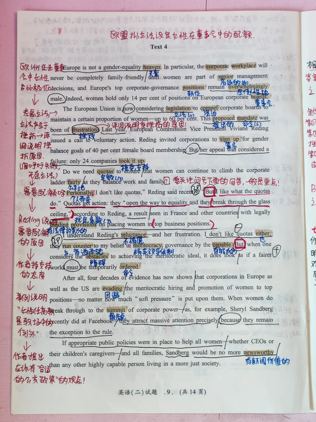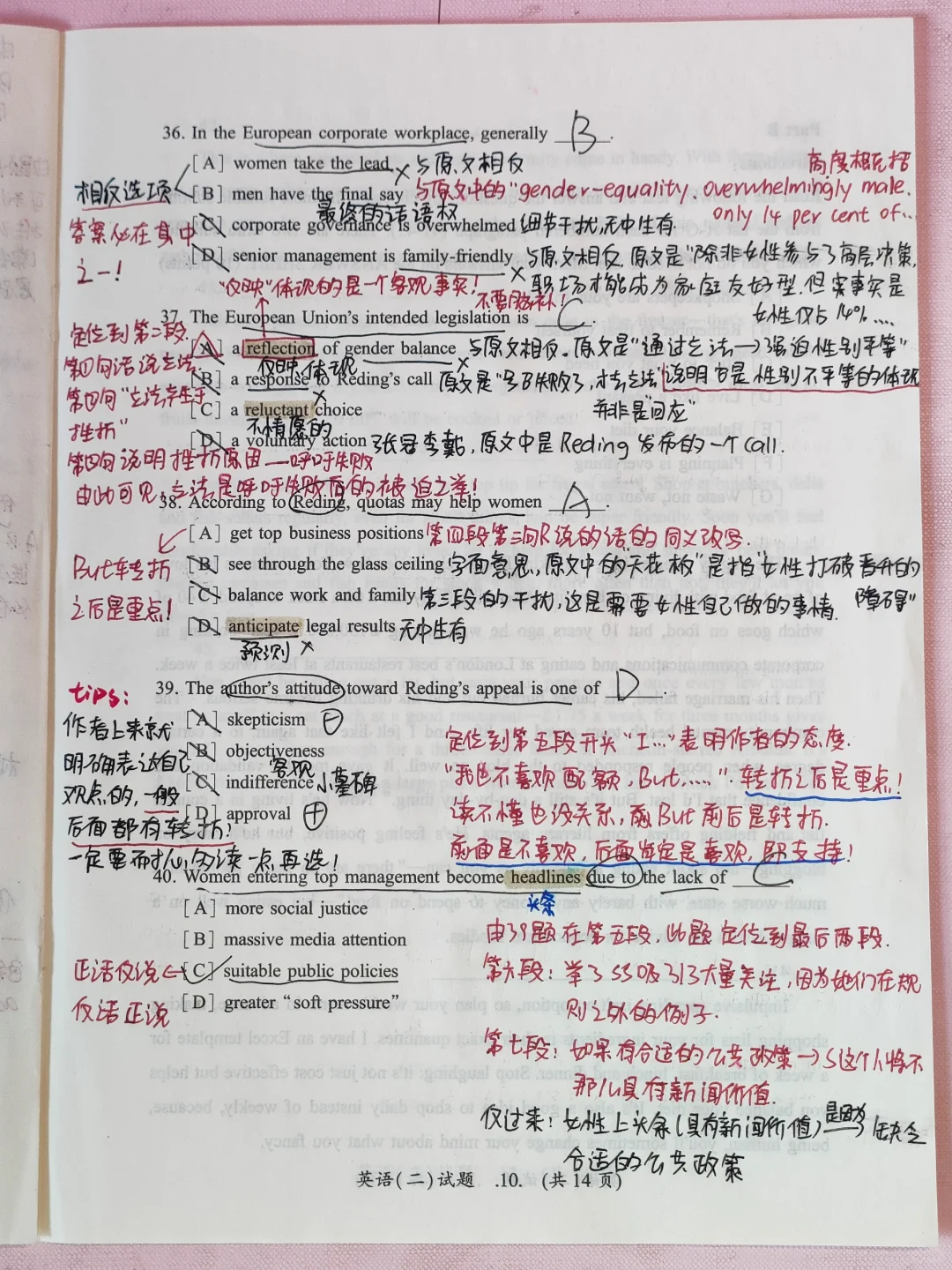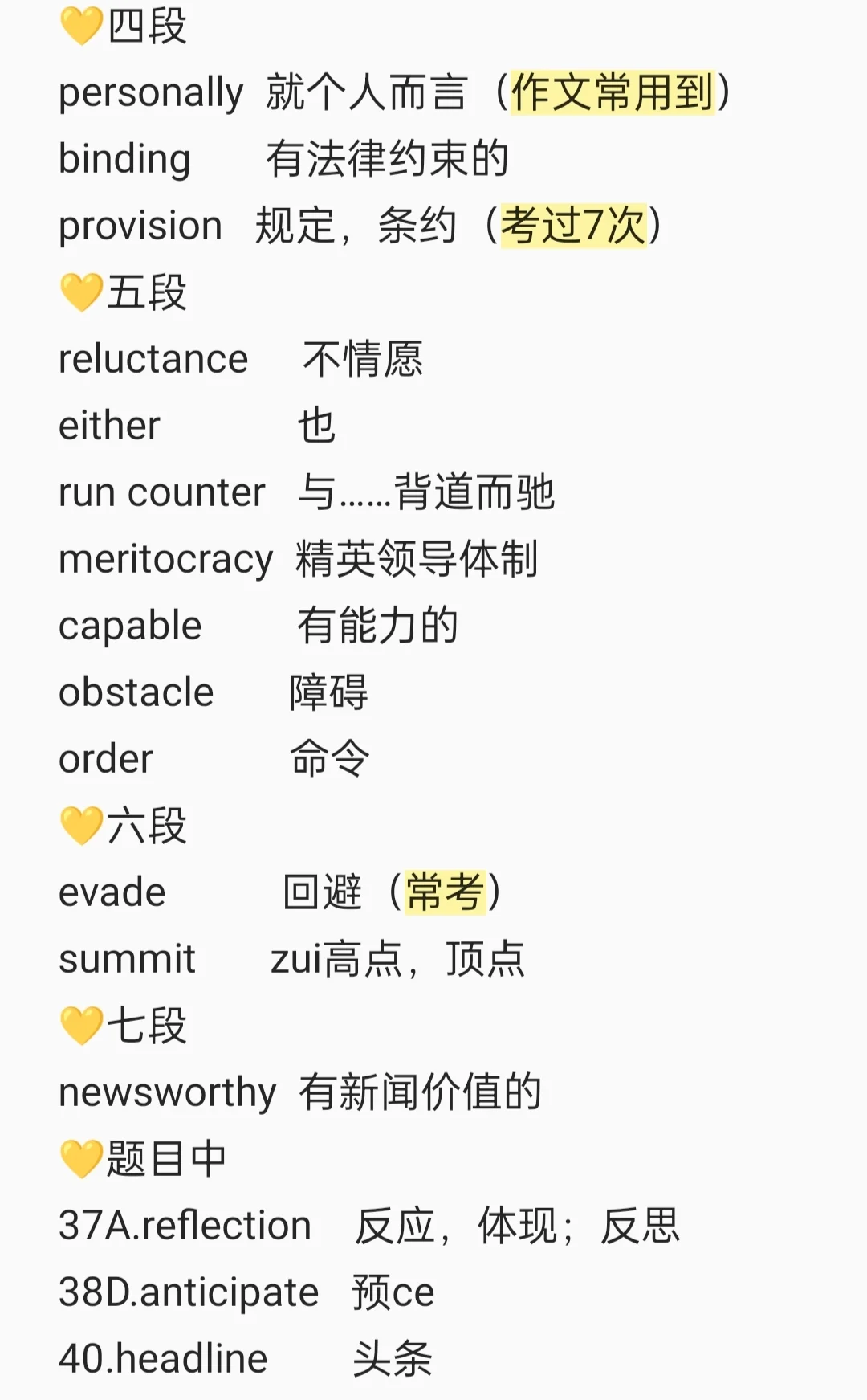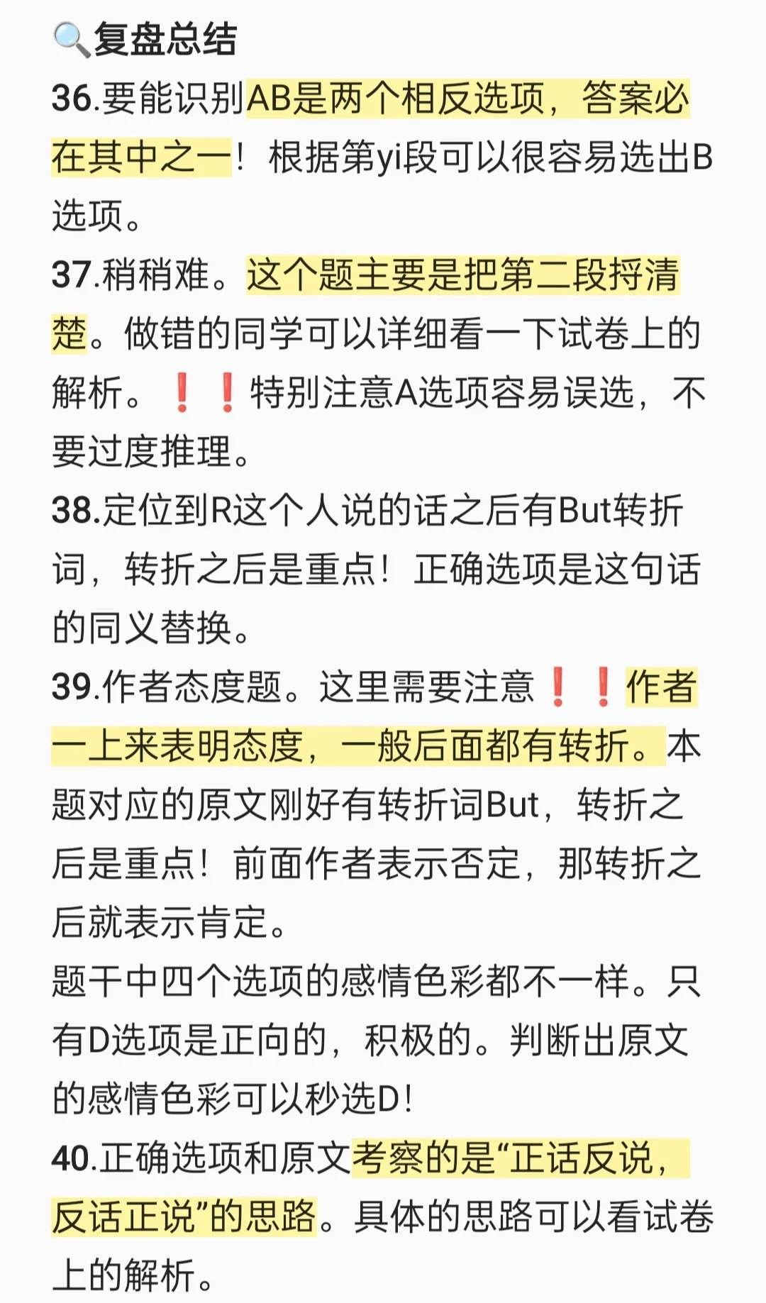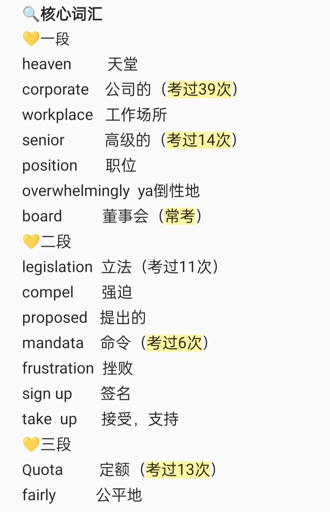 知识夏校 又被我学到了 halo宝子们,今天是英语二阅读跟练的第36天啦,05-12年阅读都在【25阅读理解D学】合集里哈~一起来看看13年Text4❗❗ 🔍核心词汇 💛一段 heaven         天堂 corporate    公司的(考过39次) workplace   工作场所 senior          高级的(考过14次) position       职位 overwhelmingly  ya倒性地 board          董事会(常考) 💛二段 legislation  立法(考过11次) compel       强迫 proposed   提出的 mandata    命令(考过6次) frustration  挫败 sign up       签名 take  up      接受,支持 💛三段 Quota         定额(考过13次) fairly          公平地 💛四段 personally  就个人而言(作文常用到) binding       有法律约束的 provision   规定,条约(考过7次) 💛五段 reluctance     不情愿 either             也 run counter   与……背道而驰 meritocracy  精英领导体制 capable         有能力的 obstacle       障碍 order             命令 💛六段 evade           回避(常考) summit       zui高点,顶点 💛七段 newsworthy  有新闻价值的 💛题目中 37A.reflection    反应,体现;反思 38D.anticipate   预ce 40.headline        头条 —— 🔍复盘总结 [三R][六R].要能识别AB是两个相反选项,答案必在其中之一!根据第yi段可以很容易选出B选项。 [三R][七R].稍稍难。这个题主要是把第二段捋清楚。做错的同学可以详细看一下试卷上的解析。❗❗特别注意A选项容易误选,不要过度推理。 [三R][八R].定位到R这个人说的话之后有But转折词,转折之后是重点!正确选项是这句话的同义替换。 [三R][九R].作者态度题。这里需要注意❗❗作者一上来表明态度,一般后面都有转折。本题对应的原文刚好有转折词But,转折之后是重点!前面作者表示否定,那转折之后就表示肯定。 题干中四个选项的感情色彩都不一样。只有D选项是正向的,积极的。判断出原文的感情色彩可以秒选D! [四R][零R].正确选项和原文考察的是“正话反说,反话正说”的思路。具体的思路可以看试卷上的解析。