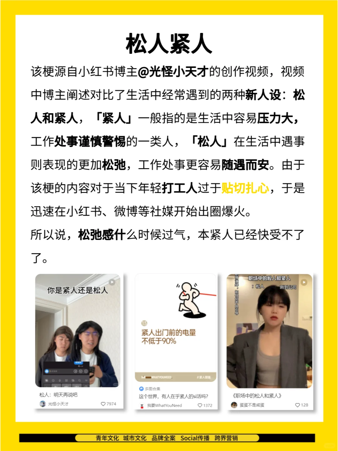 🔎年轻人最近在关注什么? 热词热梗指南,带你走进年轻人的世界! 🔥你是「松人紧人」?我感觉我更像橡皮人; 🔥你们身边有什么「卧龙凤雏」,快来分享; 🔥感觉这次奥运会「土耳其杀手」火出圈了; 🔥所以,我的「双开门男生」迷路了吗; 🔥25岁,正是银行余额为0的年纪; 你在生活中是松人还是紧人? [投票] *图源网络 关注快活Lab工作室,后面会持续更新更多营销案例、行业研究、青年洞察等相关内容干货哦!
