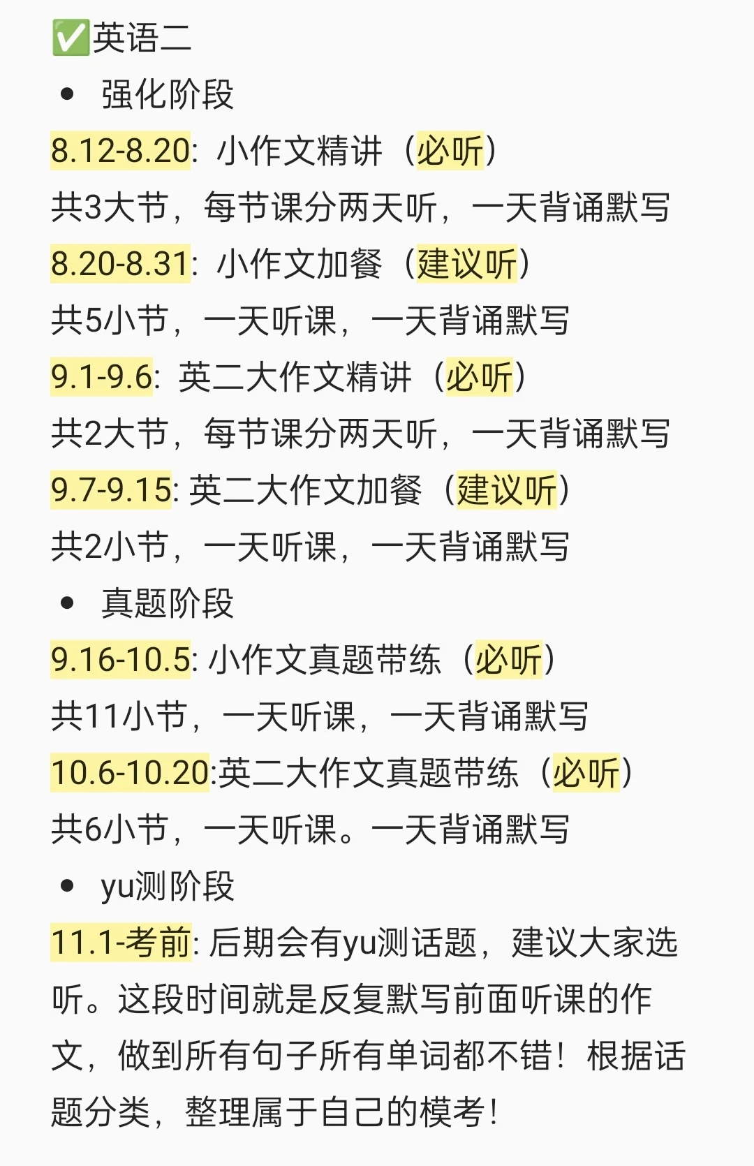 11.1-考前: 后期会有yu测话题,建议大家选听。这段时间就是反复默写前面听课的作文,做到所有句子所有单词都不错!根据话题分类,整理属于自己的模版!